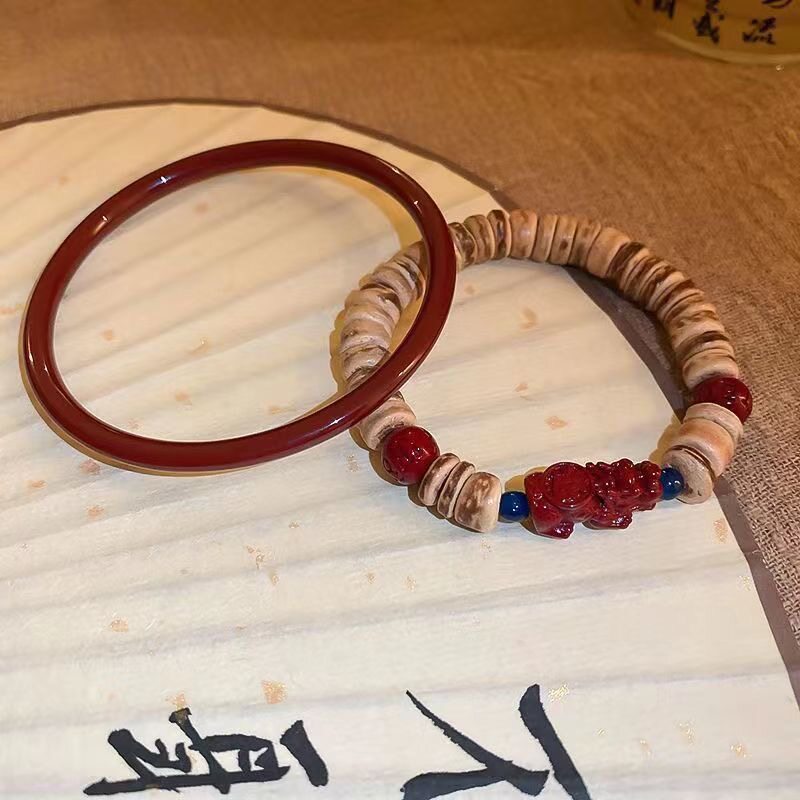 新中式椰壳朱砂串珠手镯套装ins小众设计感复古气质百搭古风手饰