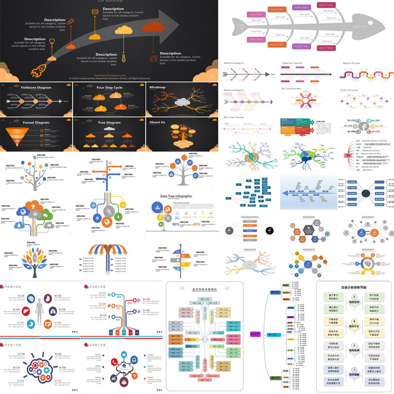 思维导图ppt模板可编辑word流程逻辑数据图表鱼骨树状逻辑时间轴