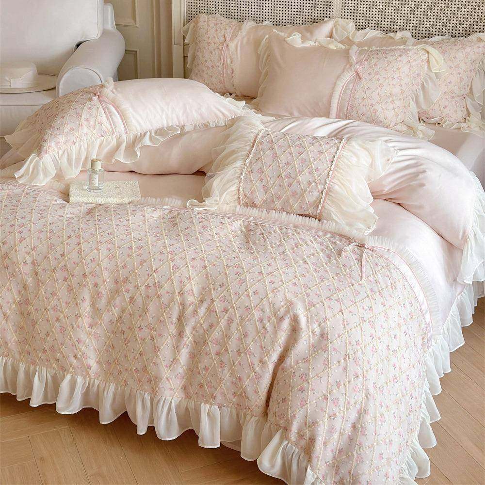 夏季冰丝凉感天丝四件套温柔小碎花刺绣花边被套公主风床品