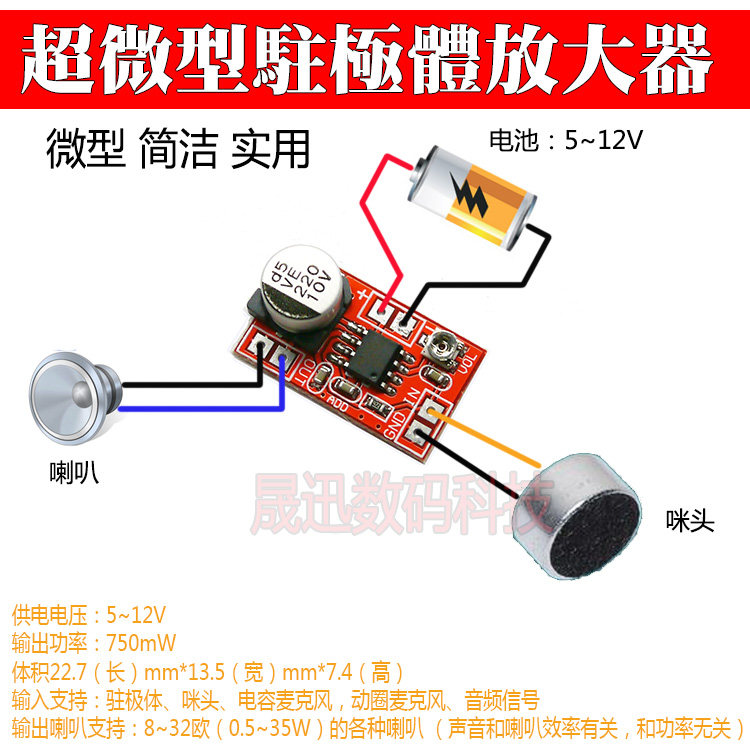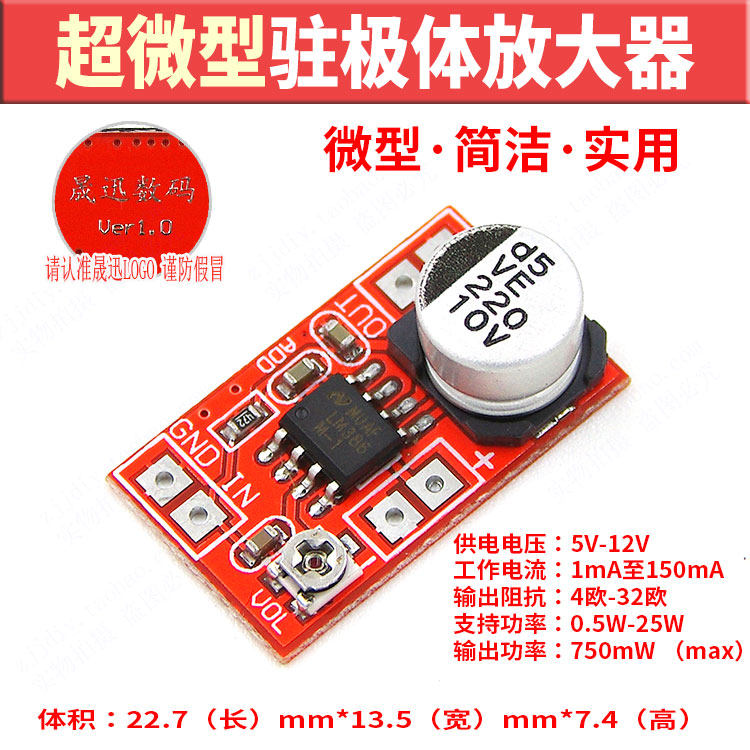 驻极体放大器电容麦克风功放板3~12V供电扩音主板音量可调超微型