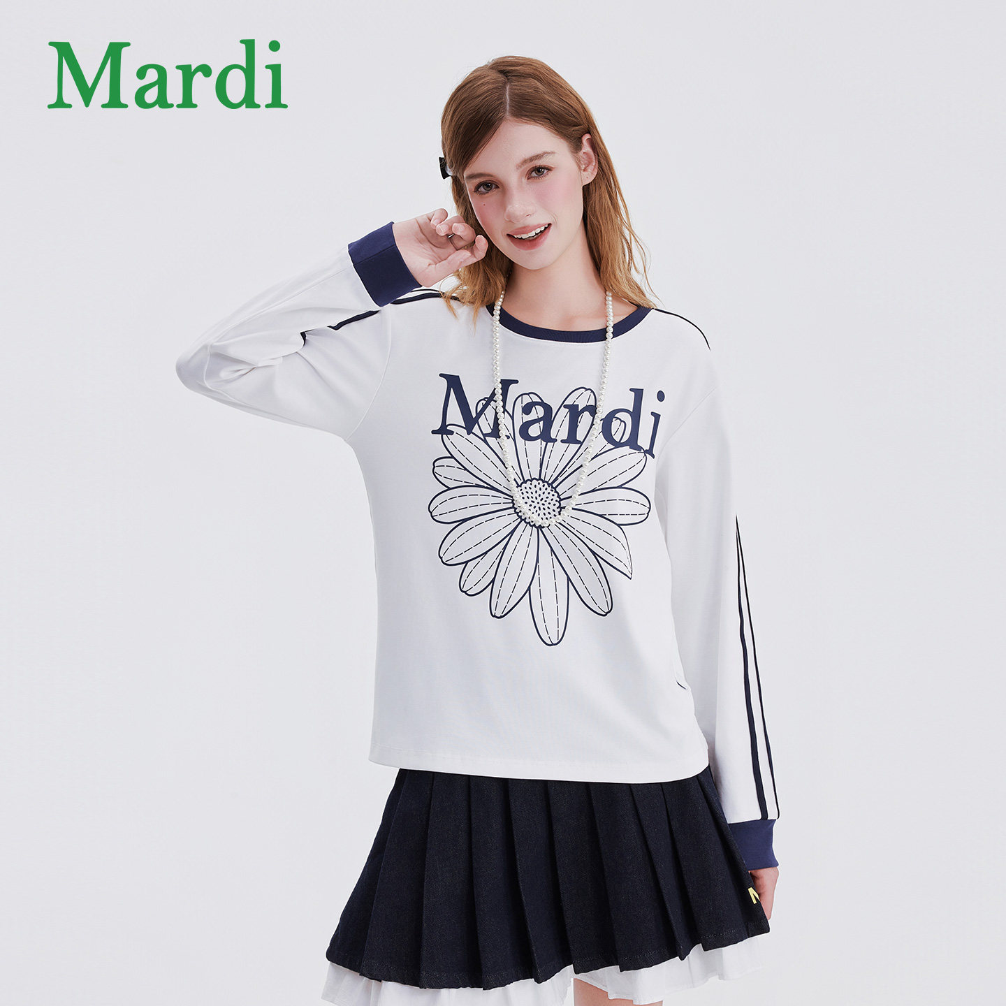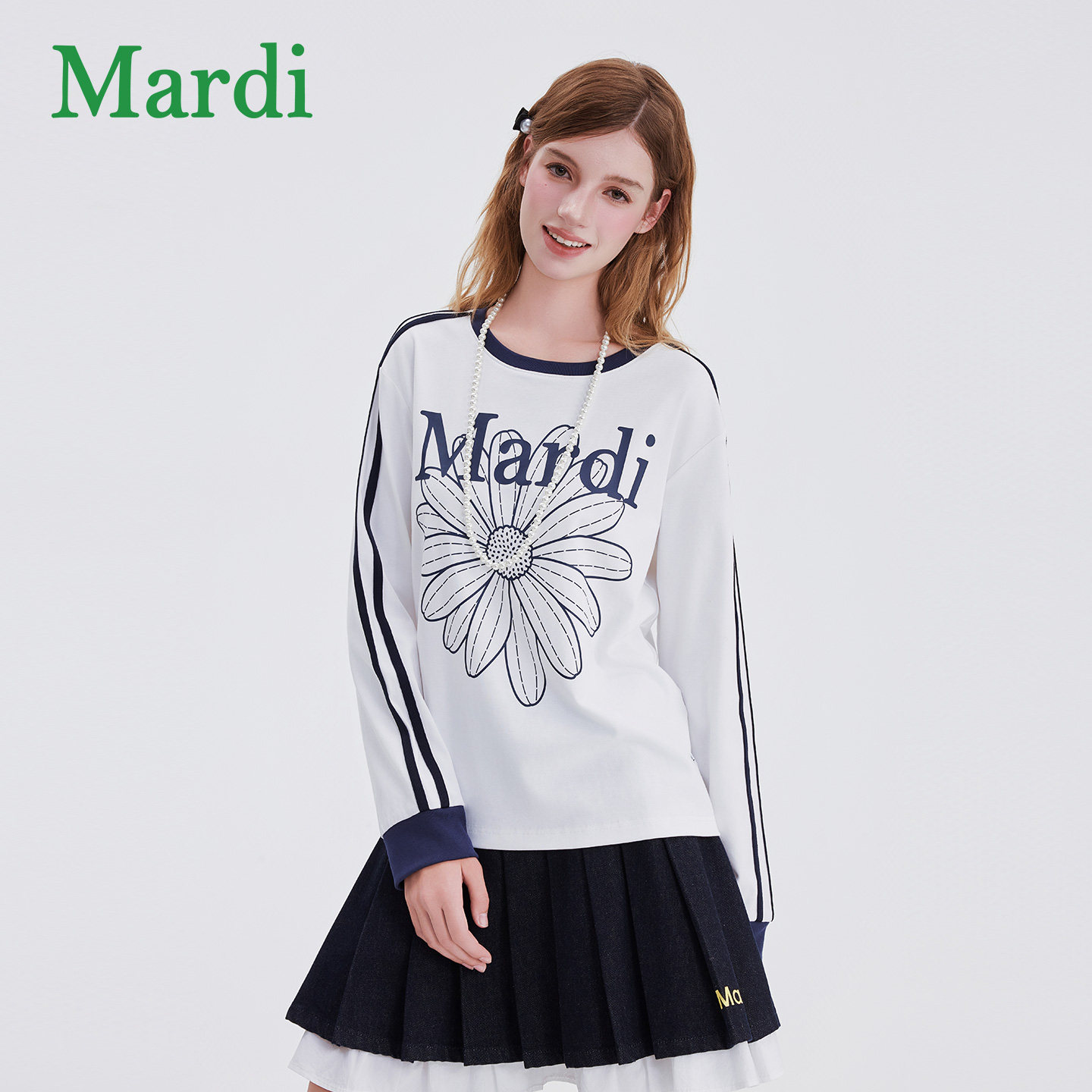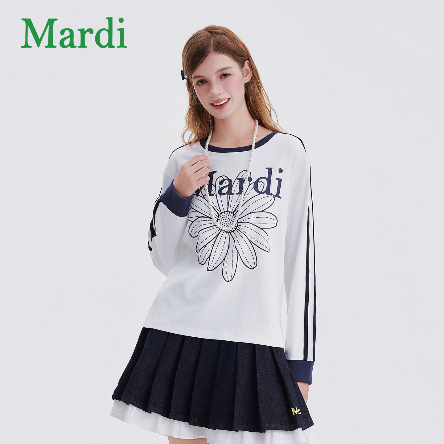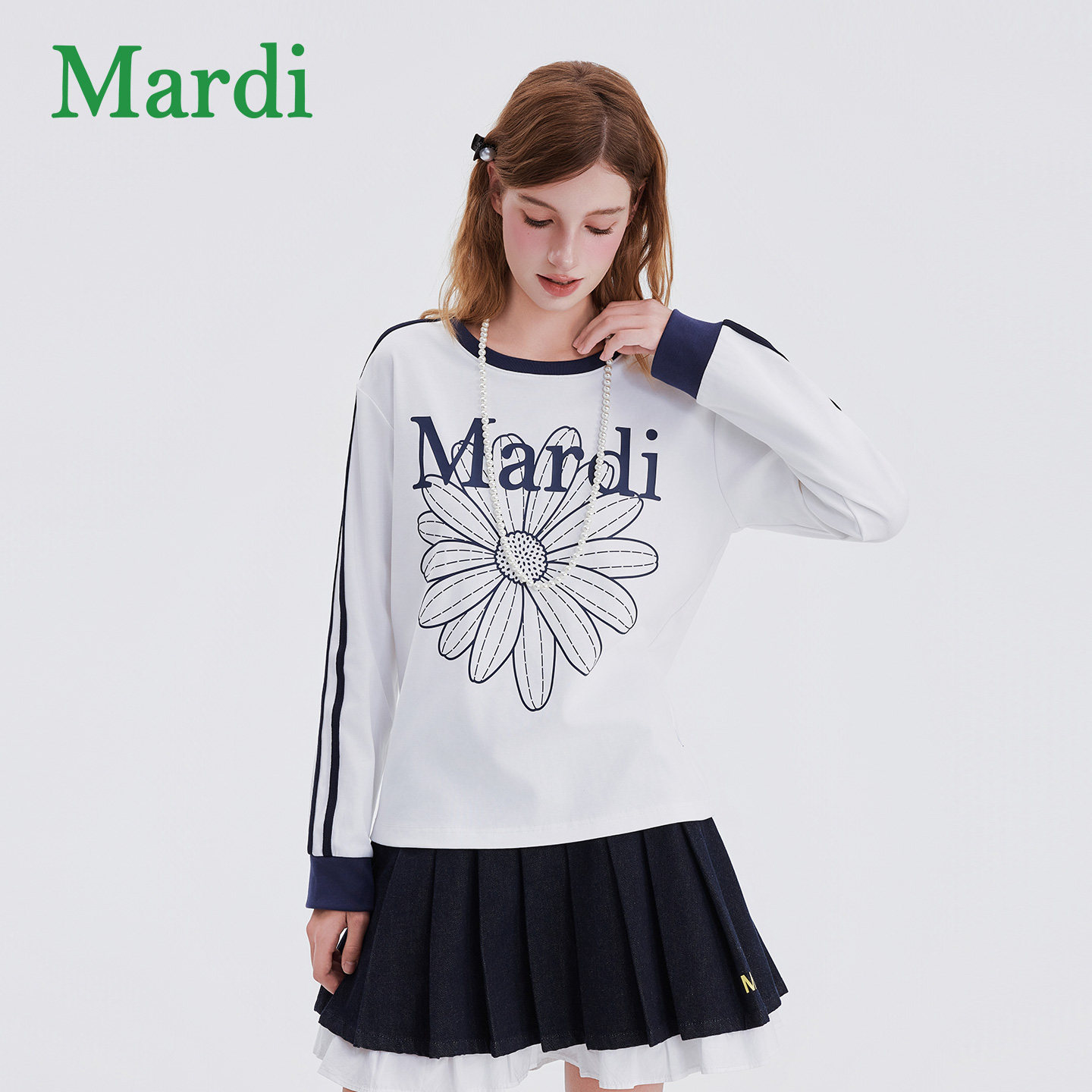 MARDI小雏菊印花长袖T恤2025秋季新款美式复古撞色拼接上衣打底衫