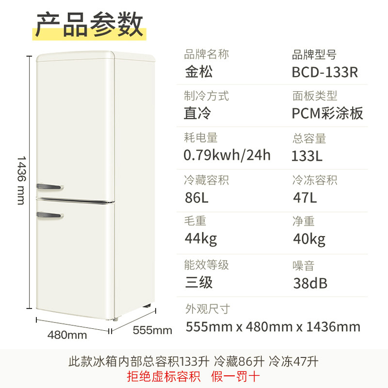 金松BCD-133R复古冰箱小型家用双门冷冻冷藏复古美式彩色网红冰箱