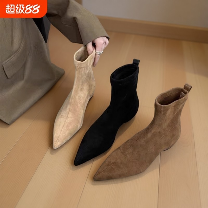 2025秋冬新款磨砂绒面平底袜靴瘦瘦靴气质尖头短靴女黑色防水台