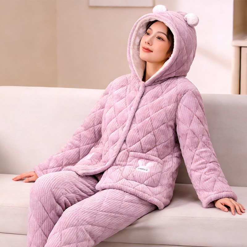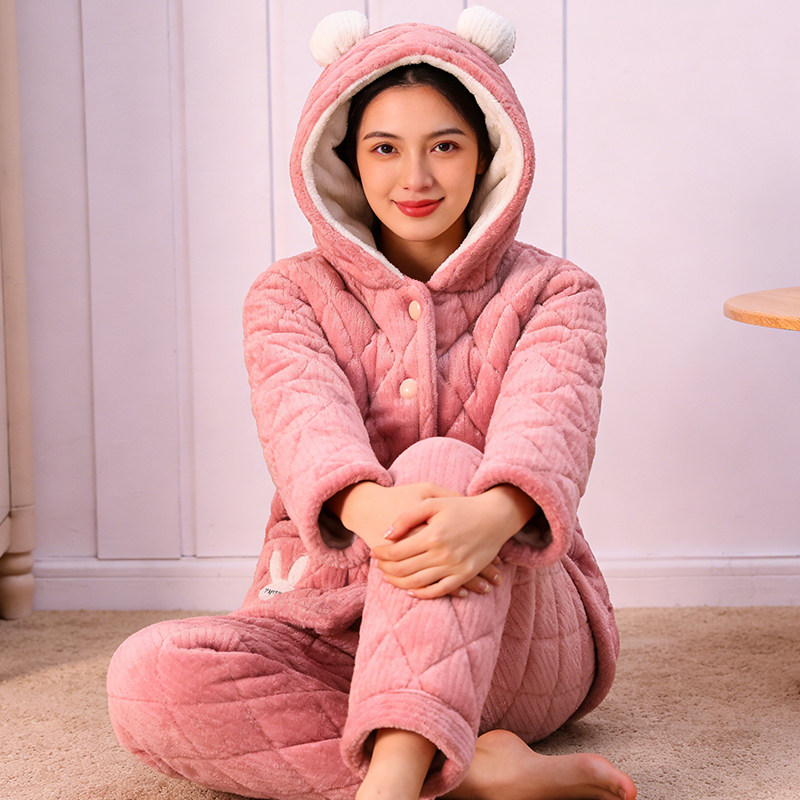 睡衣女秋冬季款珊瑚绒加厚加绒三层夹棉保暖家居服套装可外穿新款