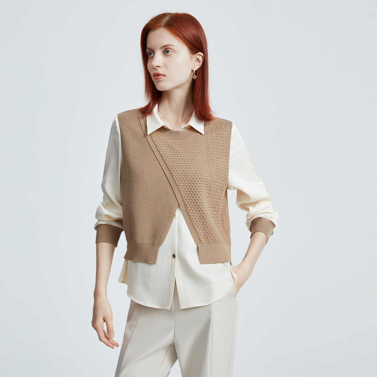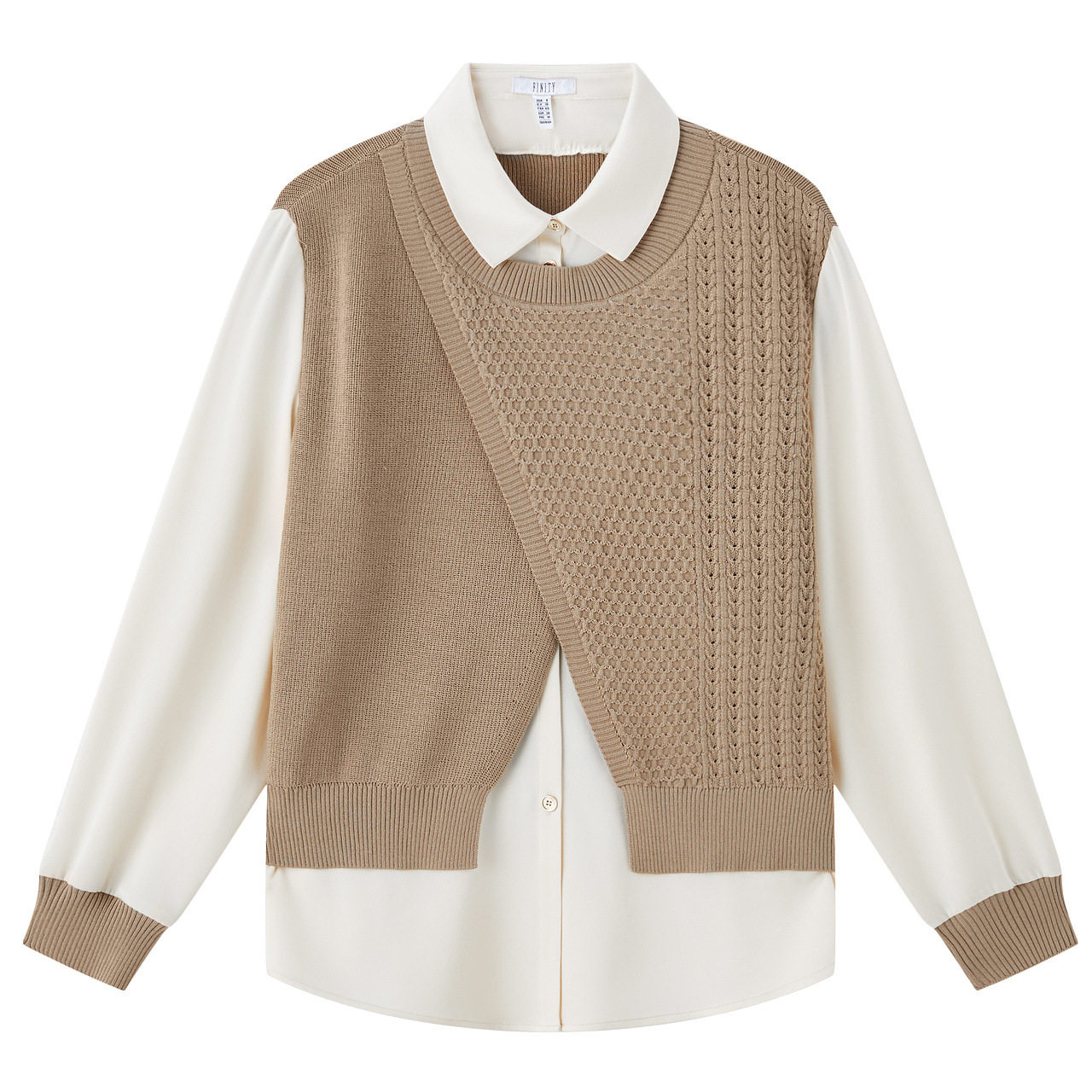 菲妮迪衬衫2025秋新款假两件拼接设计感气质休闲显瘦针织上衣女