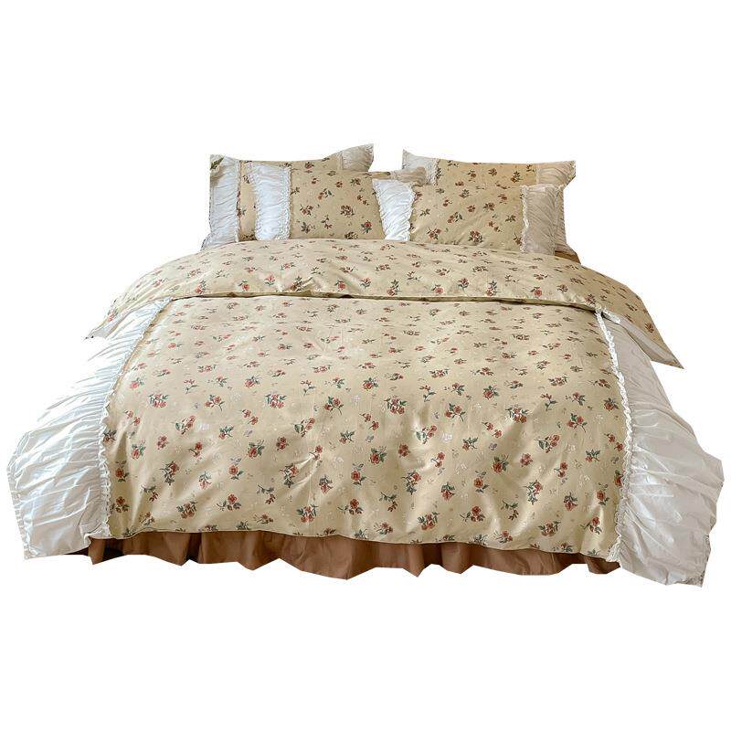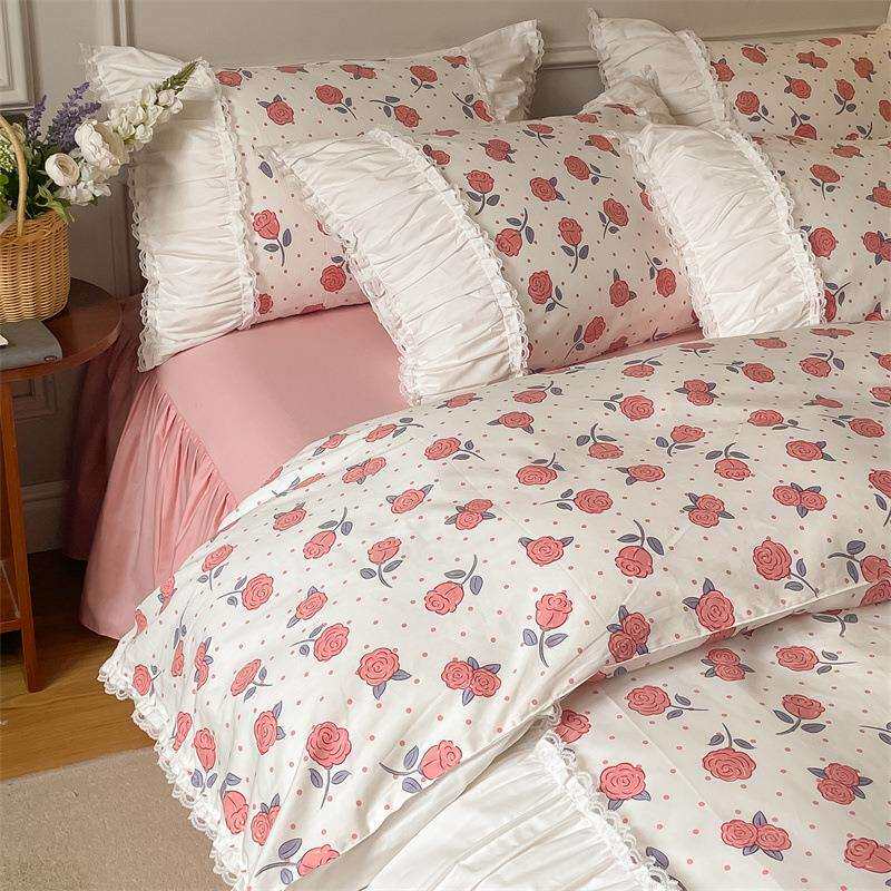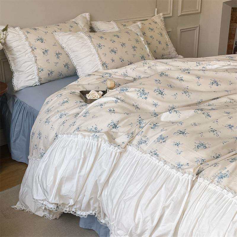 跨境法式轻奢复古纯棉四件套公主风碎花褶皱全棉床裙床单被套