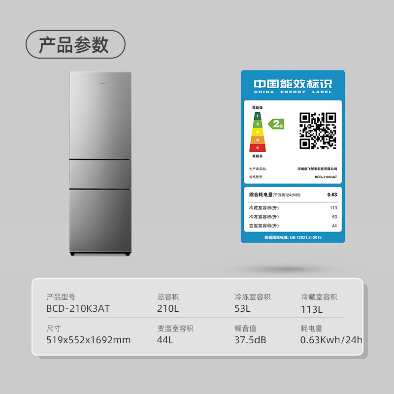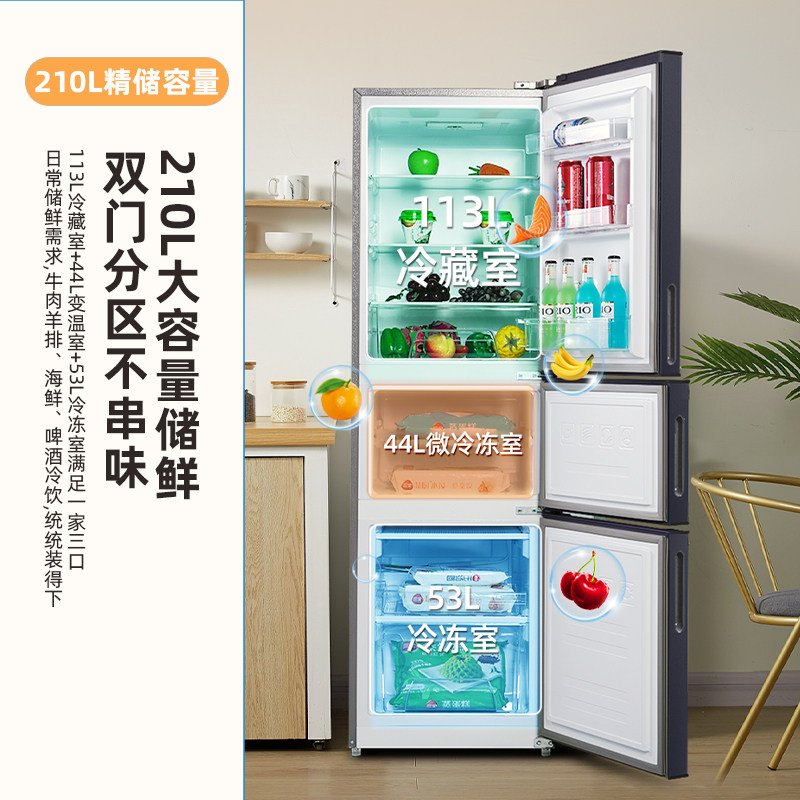 新飞210L三门小冰箱家用节能出租房宿舍冷藏冷冻三开门小型电冰箱