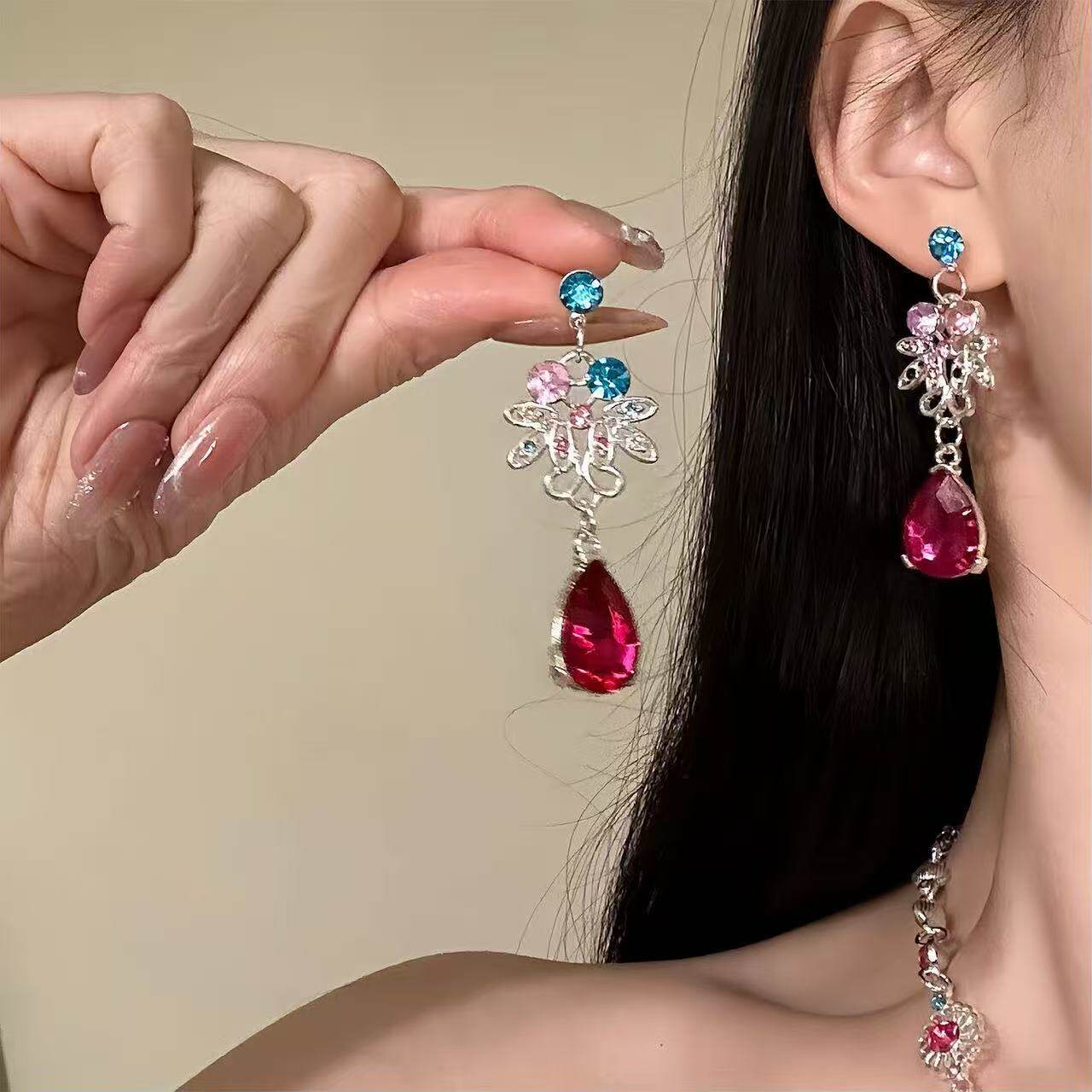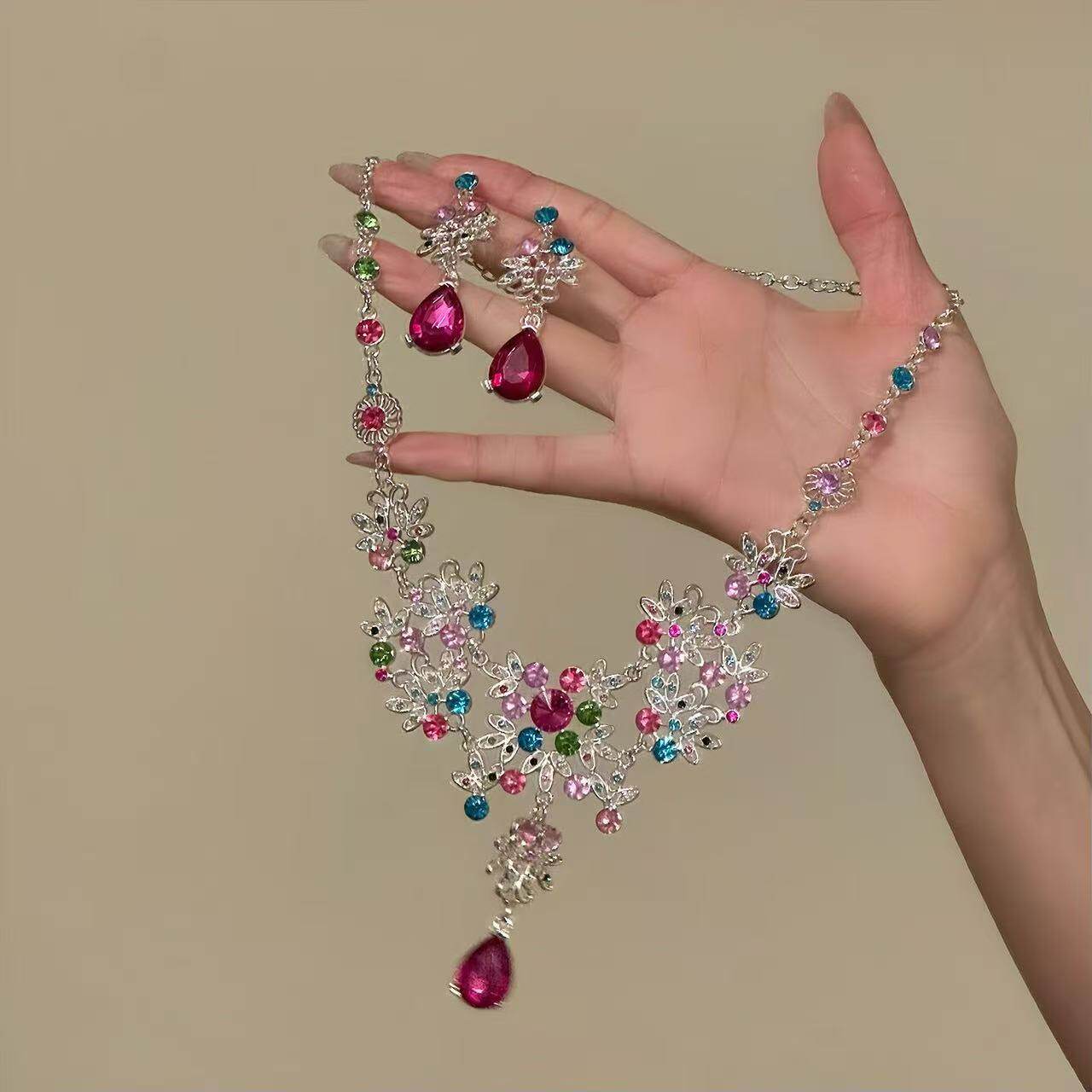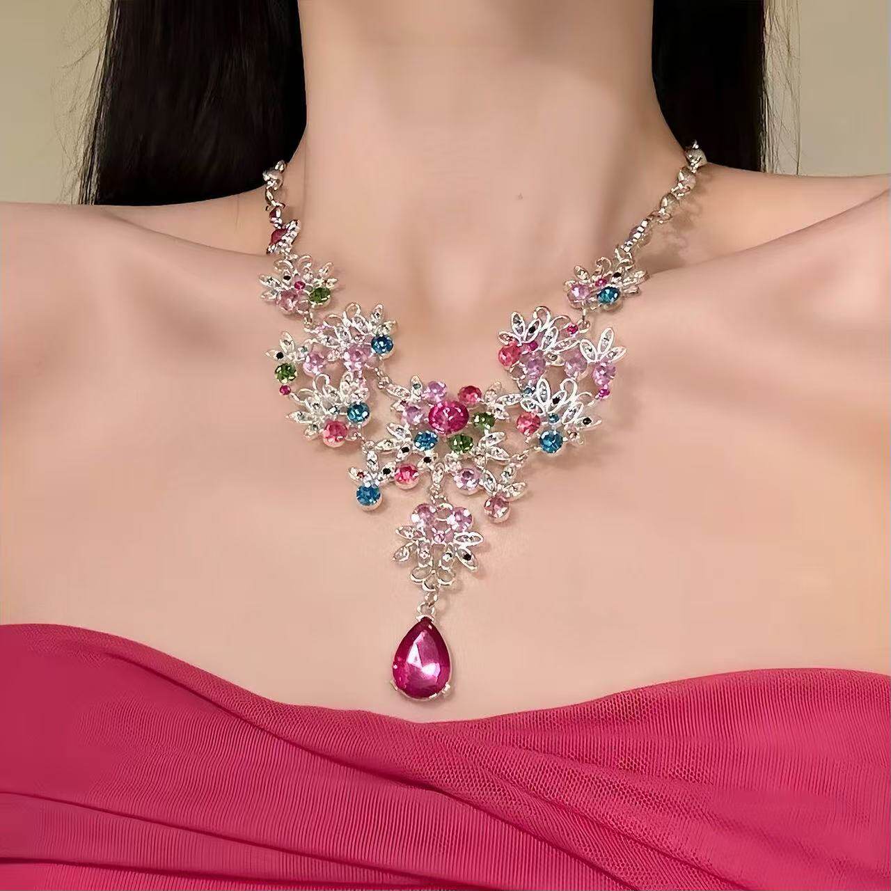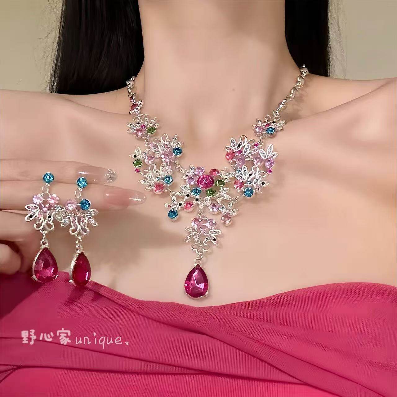 千金感粉钻水滴项链耳钉感高级设计晚礼服锁骨链颈链套装粉色锆石