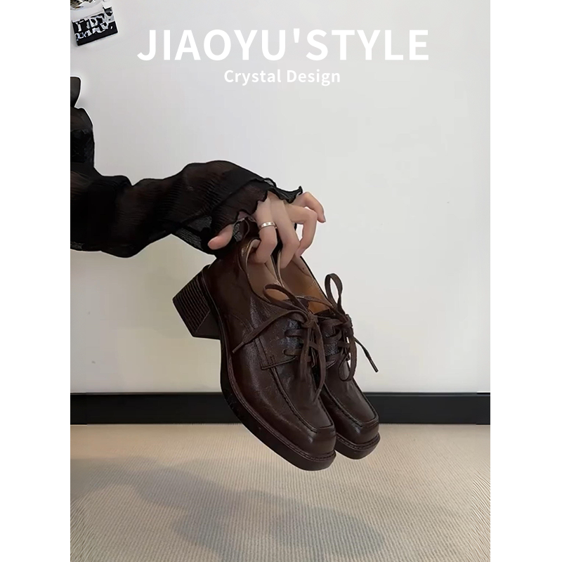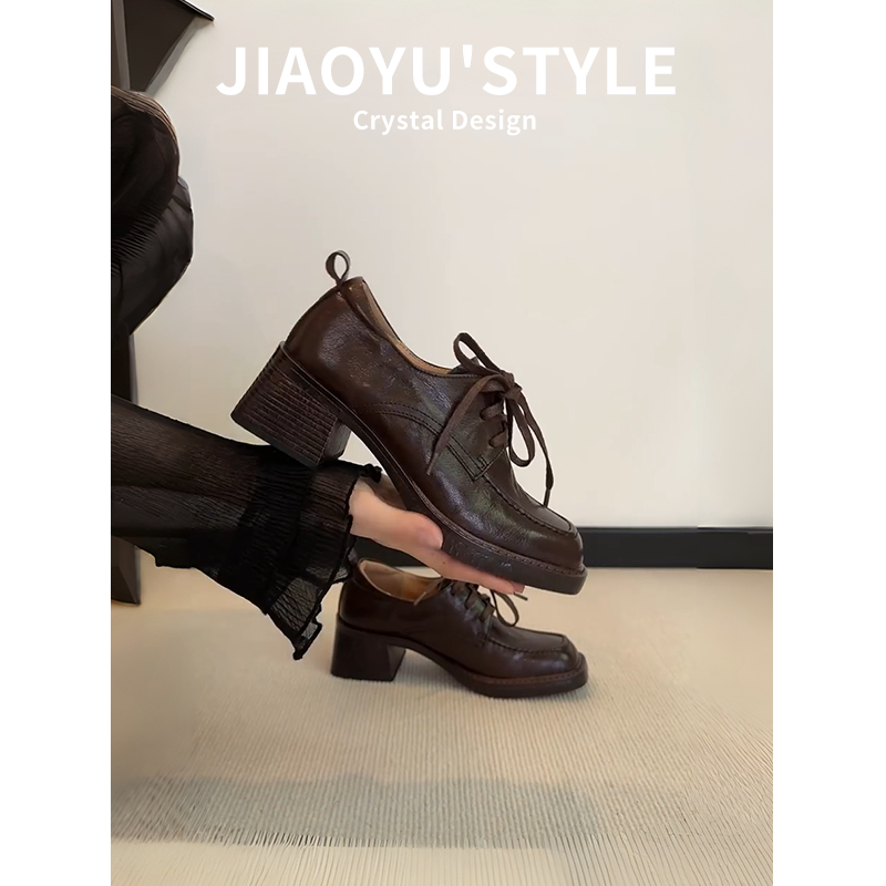 真皮~骄屿 高跟系带乐福鞋女厚底粗跟单鞋百搭复古方头增高小皮鞋