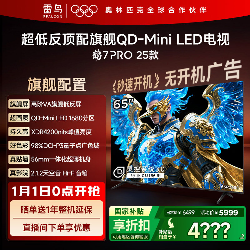 雷鸟鹤7 PRO 25款65英寸QD-MiniLED超低反电视机以旧换新补贴75