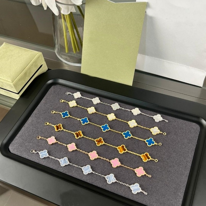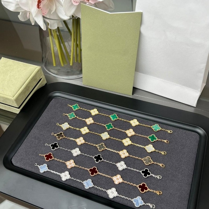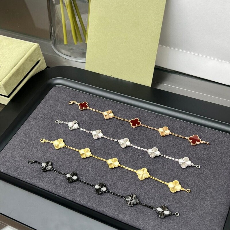 18K玫瑰金红玉髓白贝五花四叶草手链女轻奢首饰叠戴手饰黄金贝母