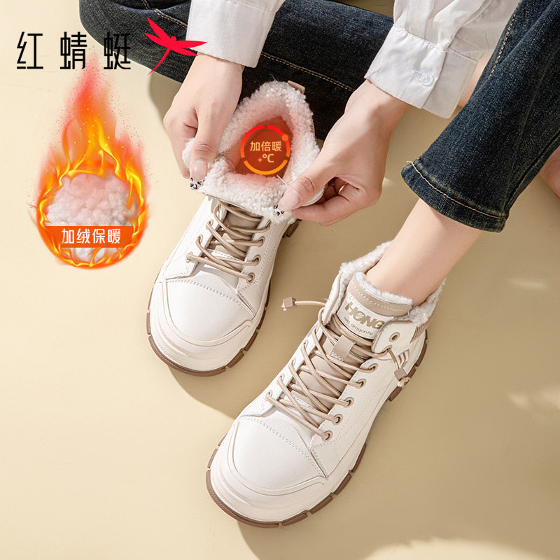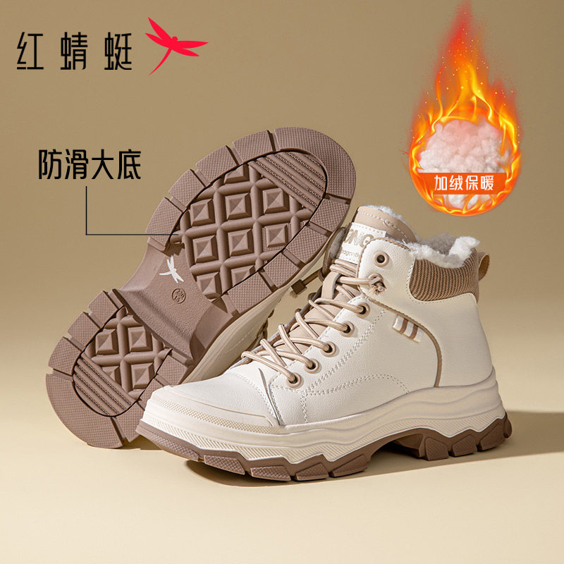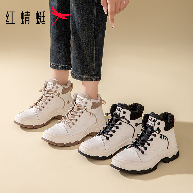 红蜻蜓秋冬新款高帮鞋加绒保暖棉鞋厚底增高休闲靴子女工装登山鞋