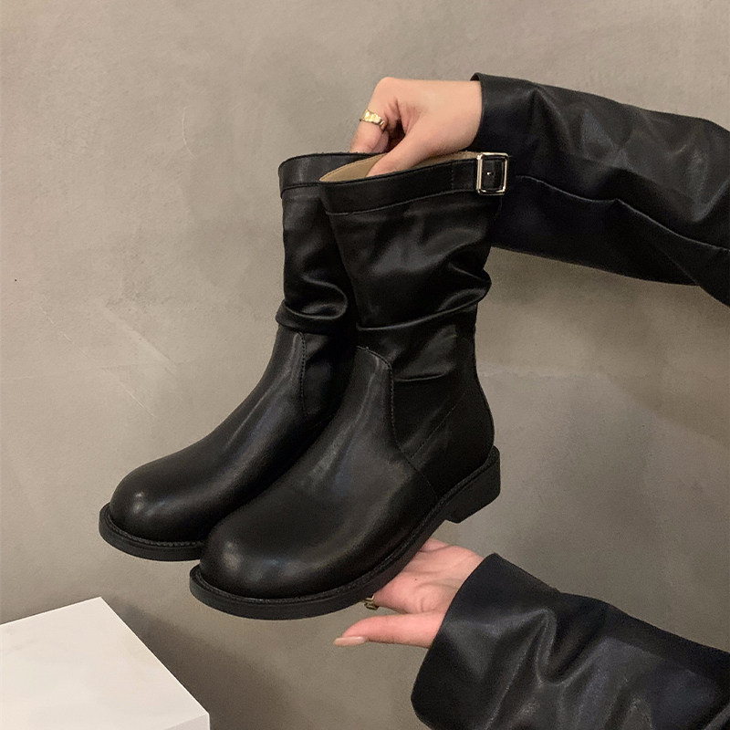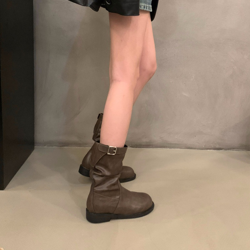 张元英同款皮带扣堆堆靴粗跟复古做旧中筒靴韩版靴子小众工装靴女