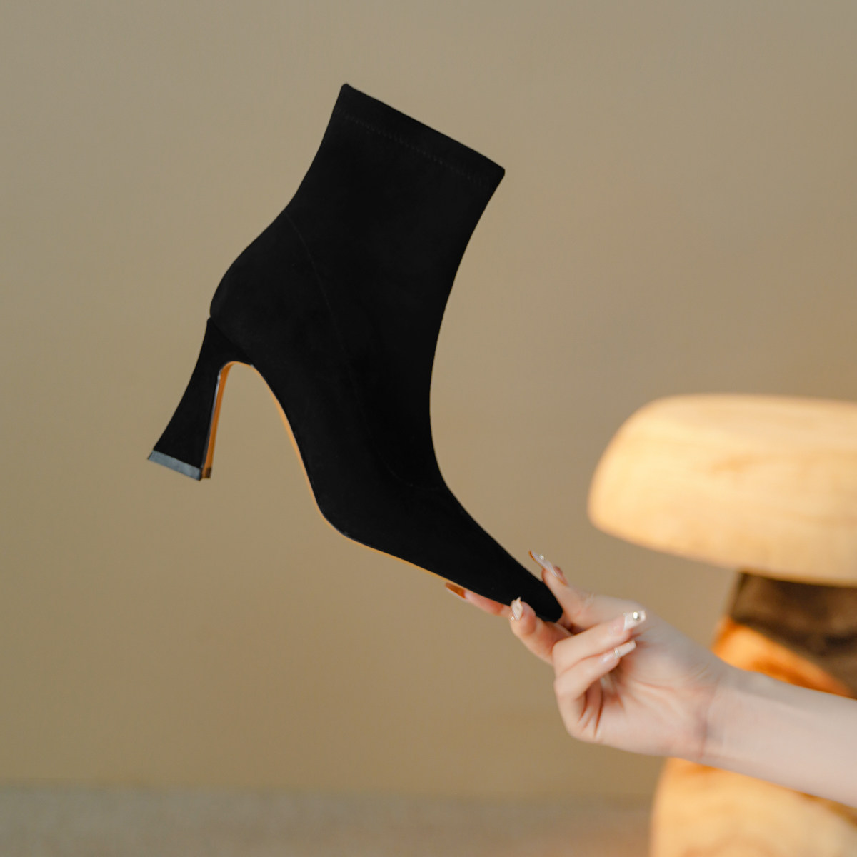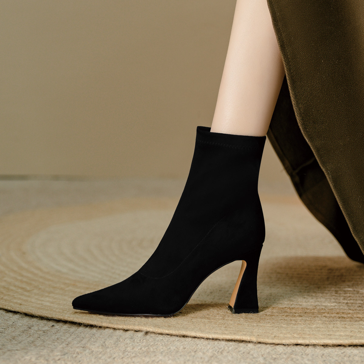 细跟高跟短靴子女2025年新款秋冬尖头绒面弹力瘦瘦靴显瘦中筒袜靴
