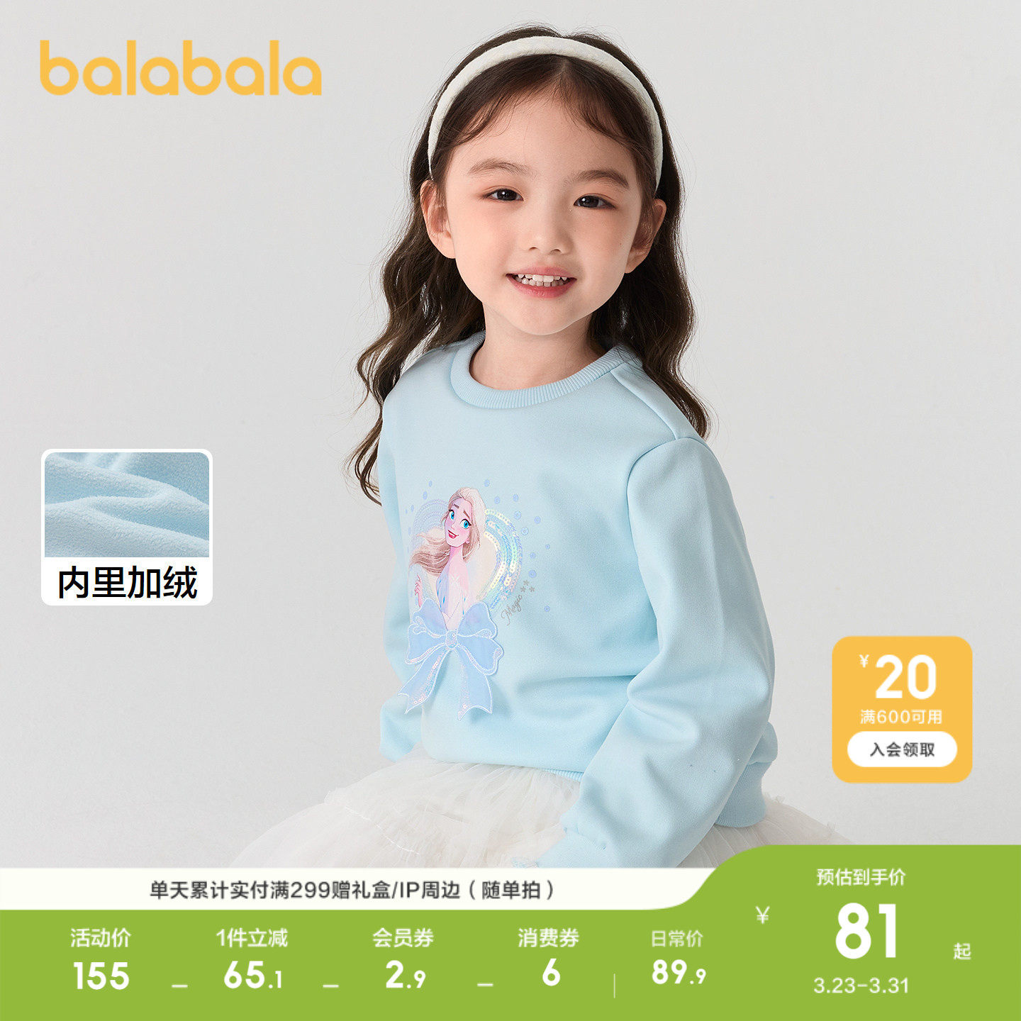 【爱莎IP】巴拉巴拉童装儿童加绒卫衣女童秋冬装上衣洋气休闲时尚