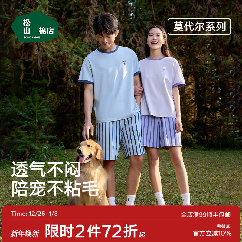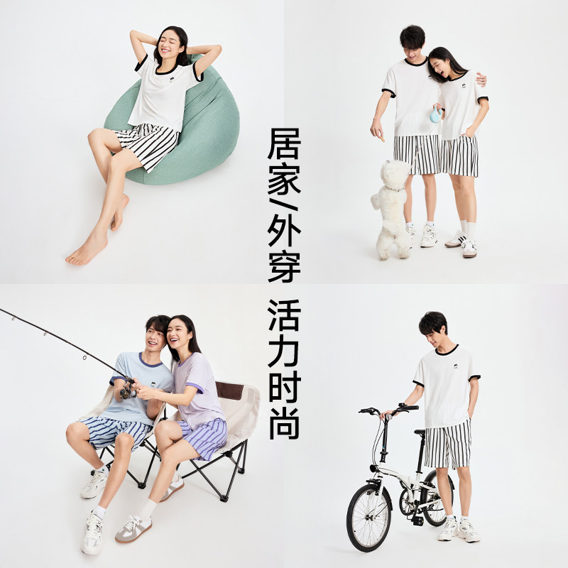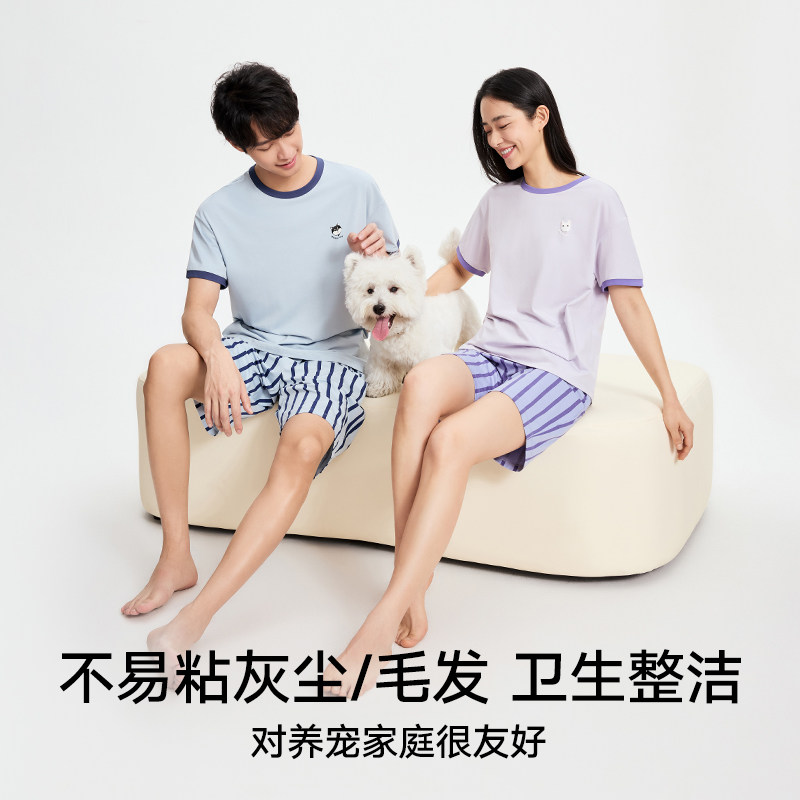 松山棉店萌宠条纹女短袖冰丝情侣睡衣莫代尔家居服套装春秋季薄款