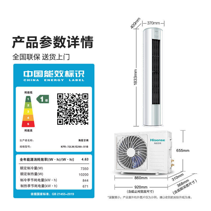 海信大3匹变频新1级能效圆柱立式柜机客厅家用冷暖除湿72省电E290