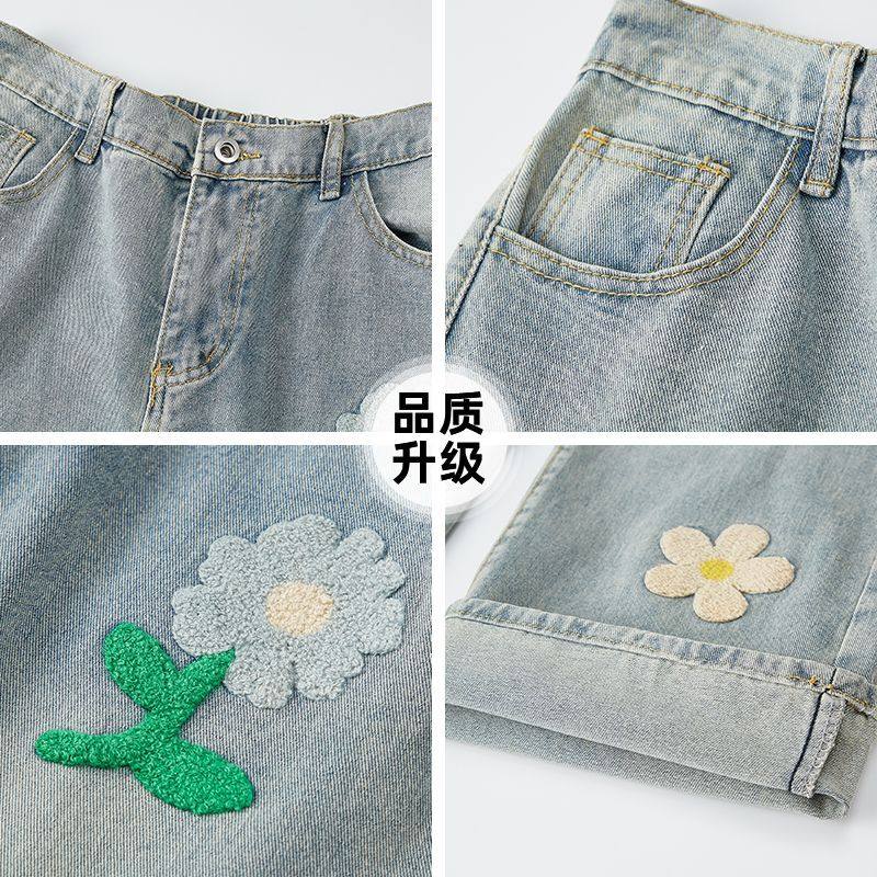 查尔斯桃心 美式高街花朵刺绣牛仔裤男女宽松直筒阔腿潮牌长裤子