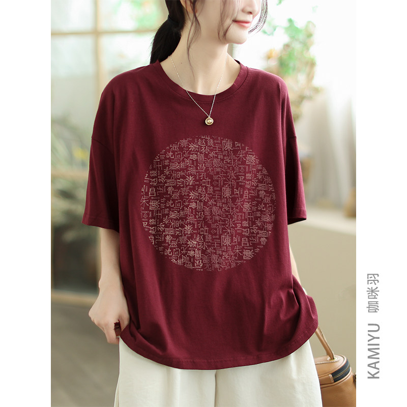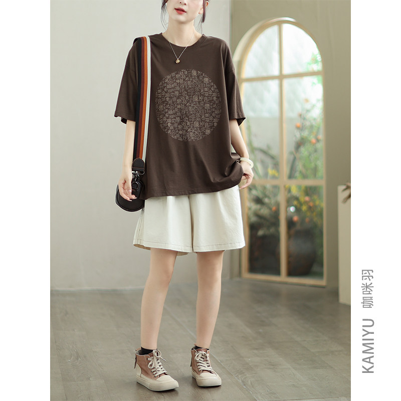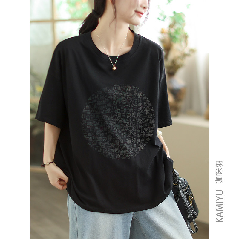 咖咪羽纯棉大码文艺休闲百搭短袖T恤女文字创意设计感圆领上衣