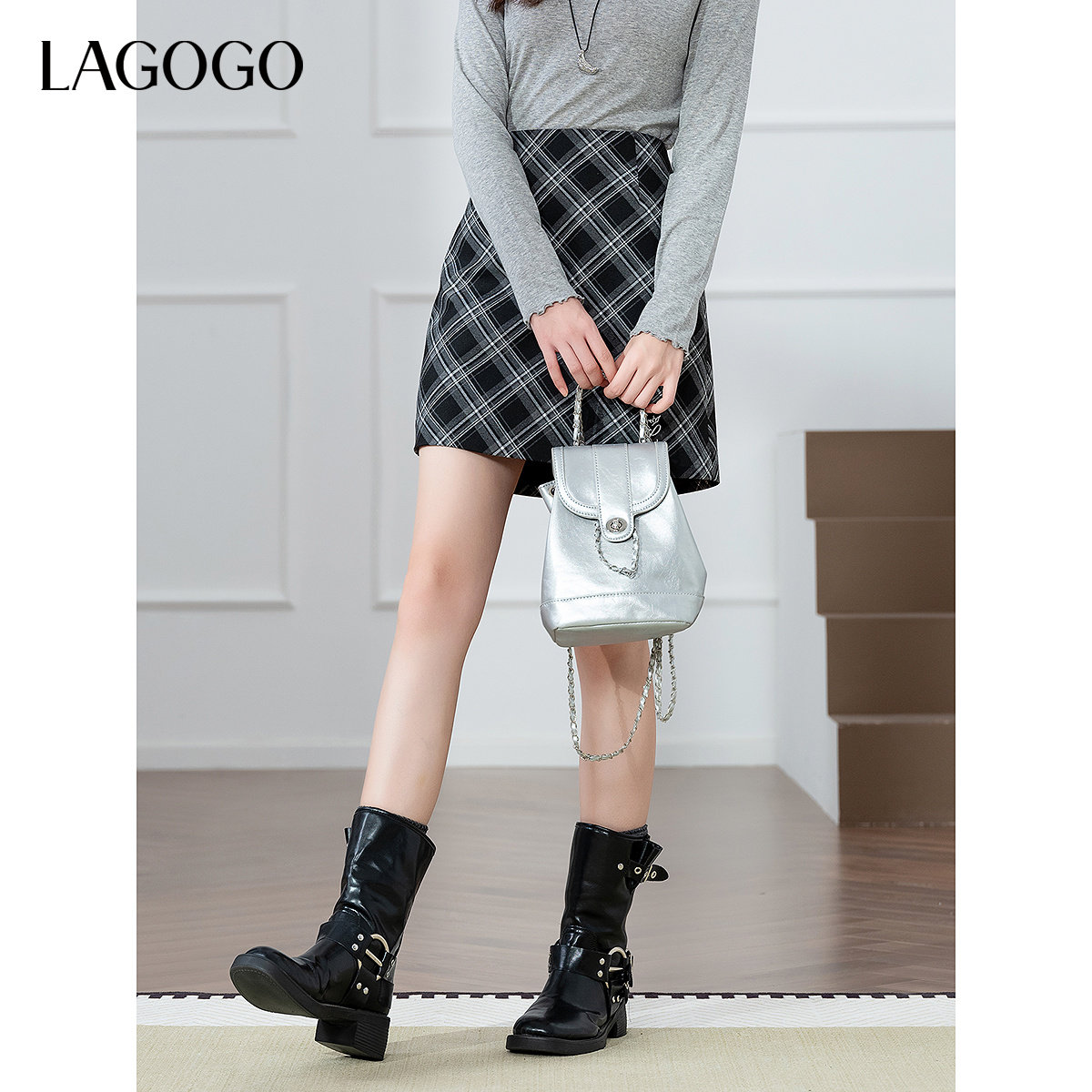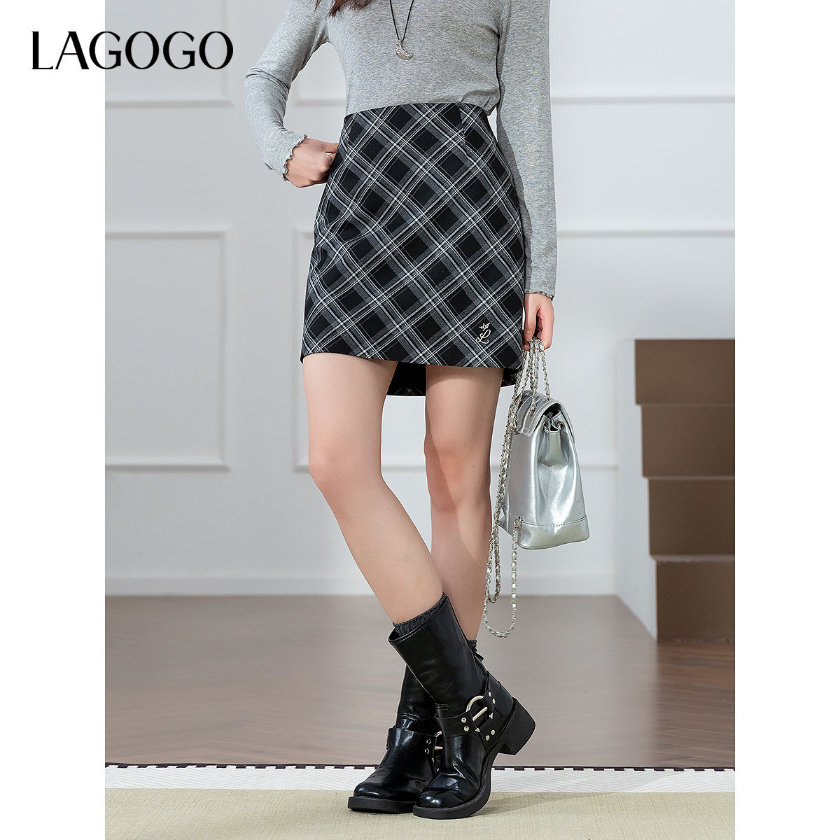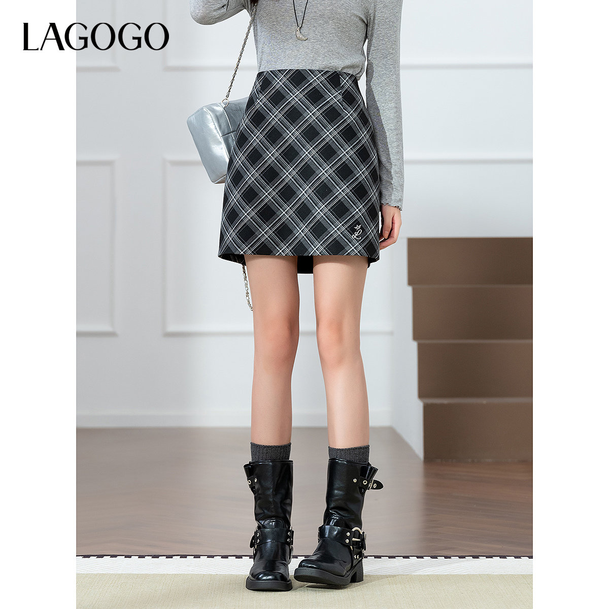 LAGOGO撞色格纹半身裙女拉谷谷2025秋冬新款时尚复古包臀短裙