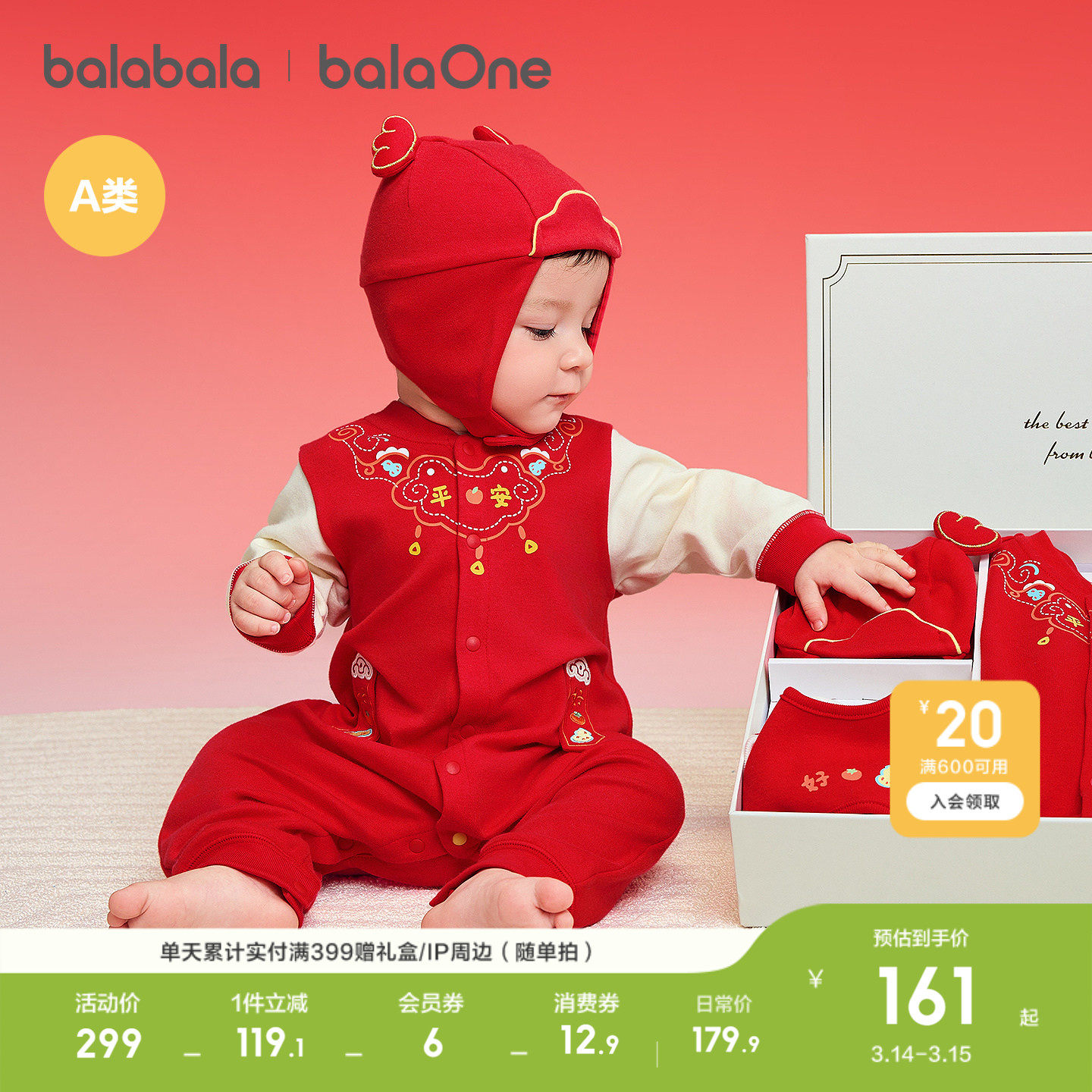 巴拉巴拉新生儿礼盒宝宝满月用品大全六件装新年礼盒初红色拜年服