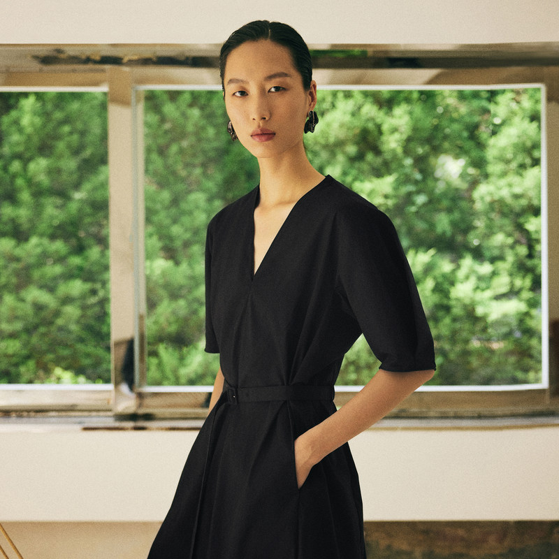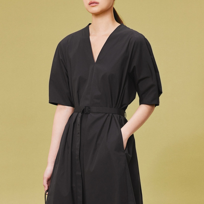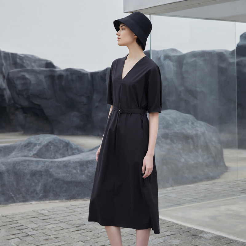 LESS夏季通勤感休闲短袖中长腰带连衣裙V领棉质职场长裙2O4G10710