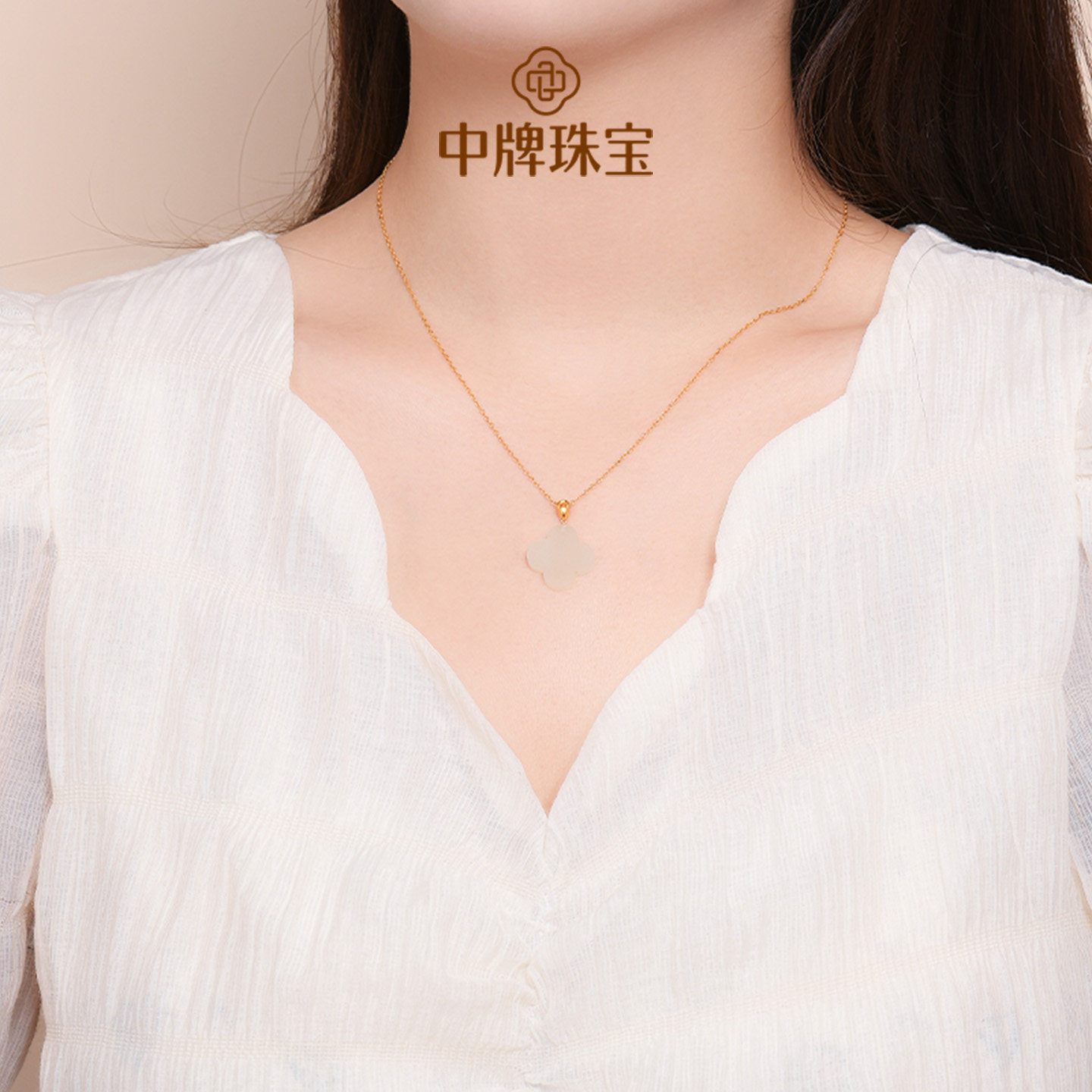 18K四叶草吊坠白月光项链AU750金镶玉锁骨链和田玉挂坠玉石首饰女