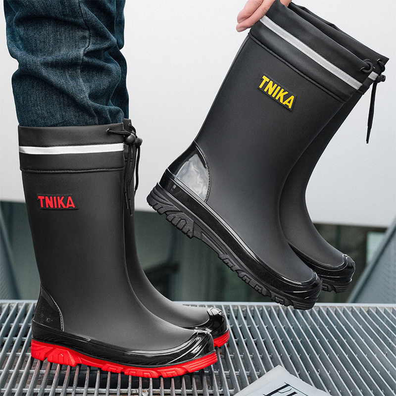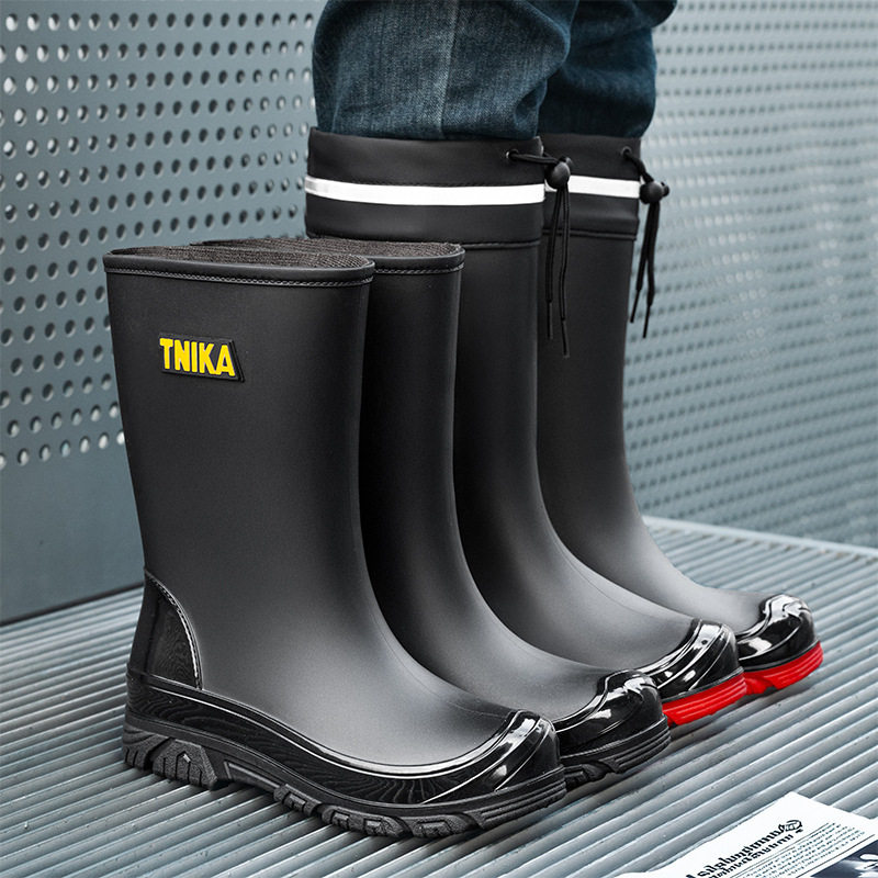 户外英伦男中雨鞋夜间反光一体束口防水鞋防滑男雨靴钓鱼胶鞋中筒