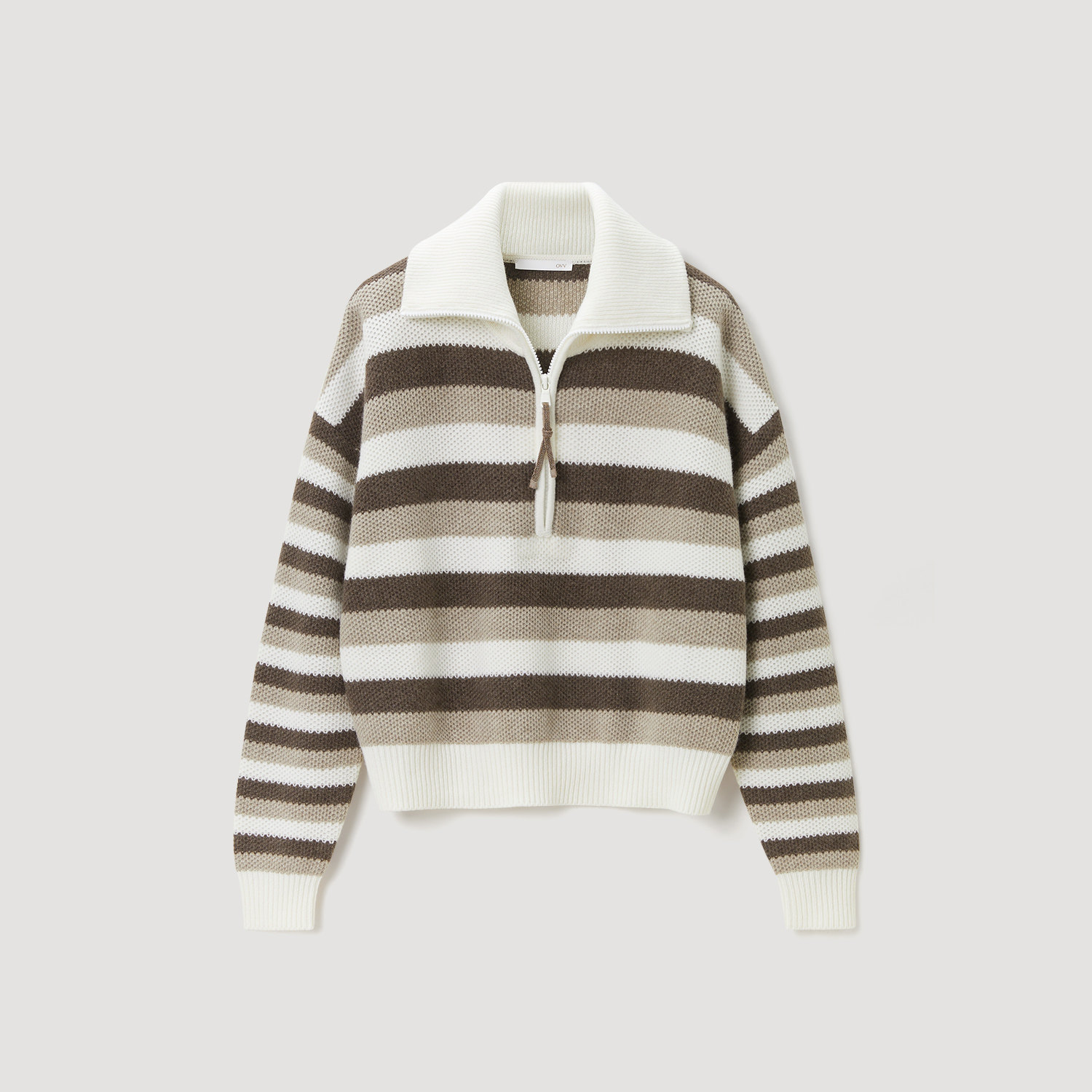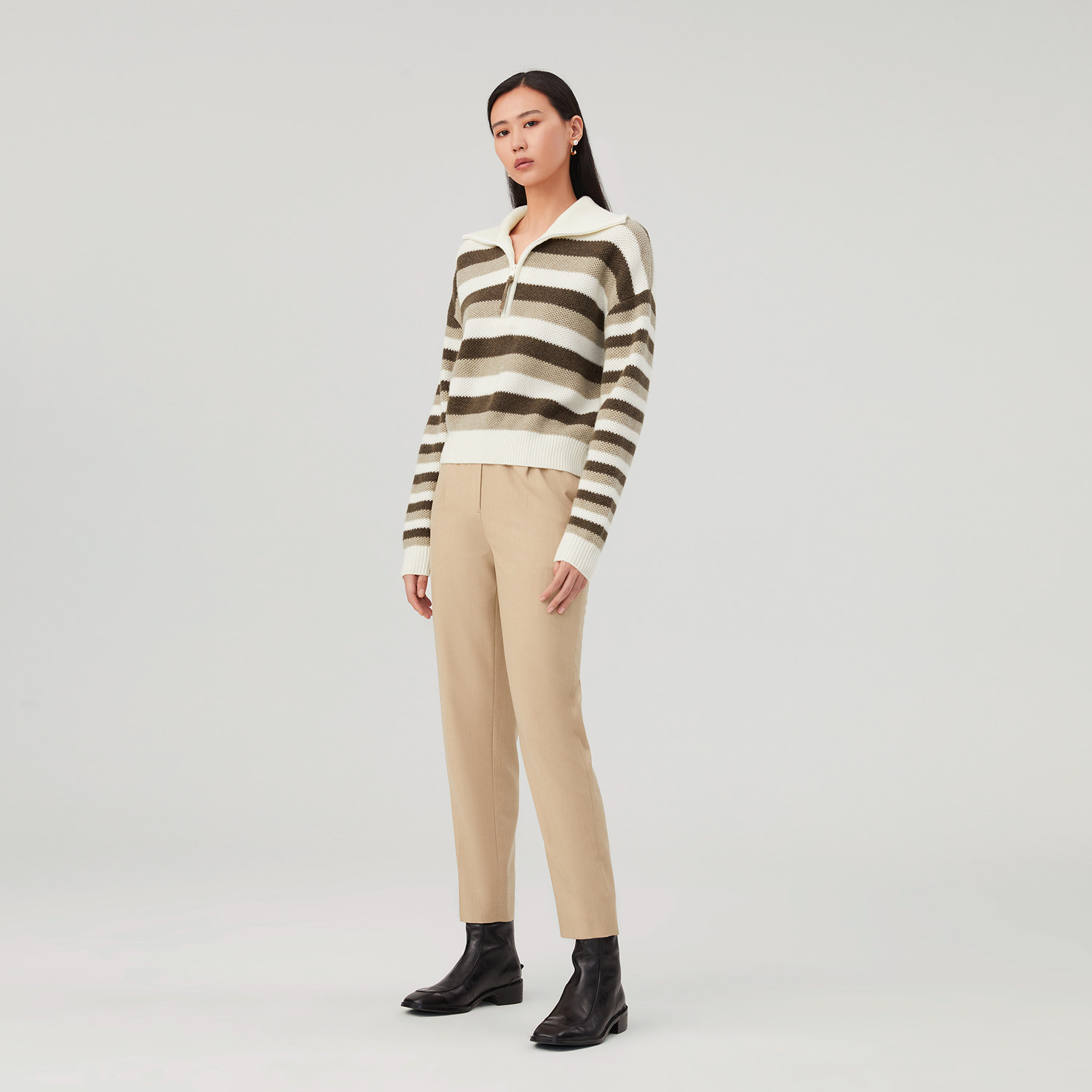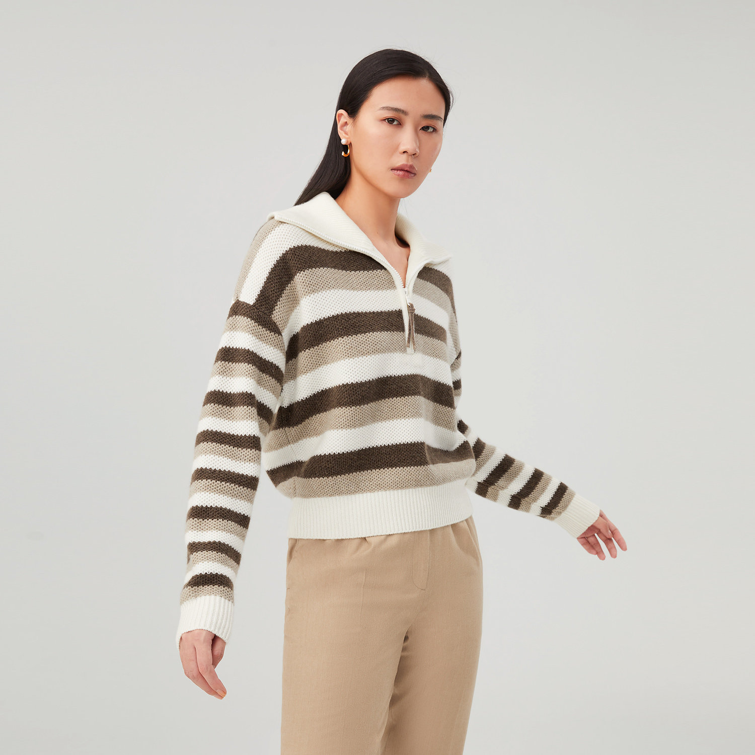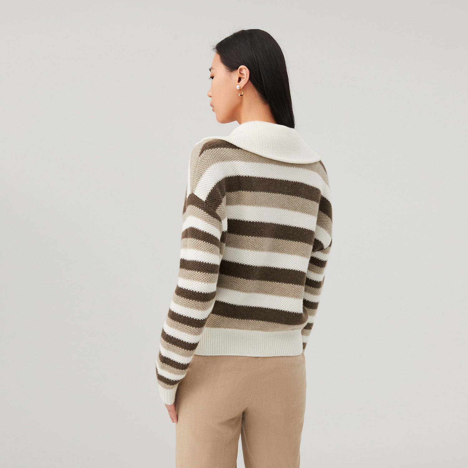 OVV秋冬新款女装羊毛羊绒翻领半开襟经典条纹长袖针织衫