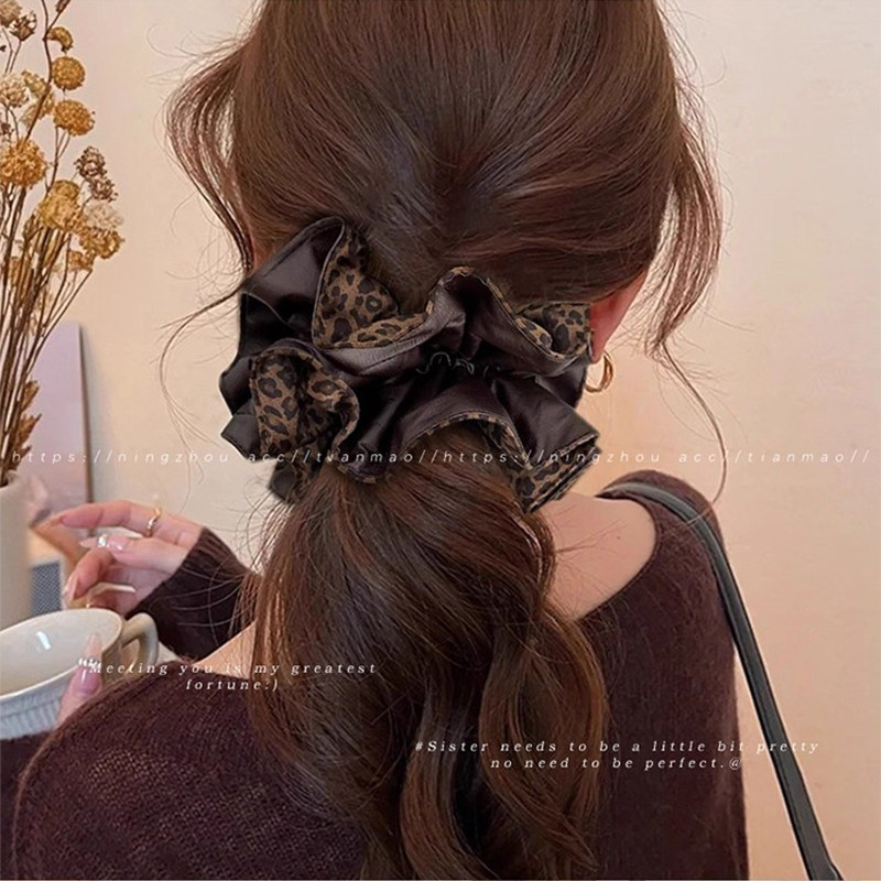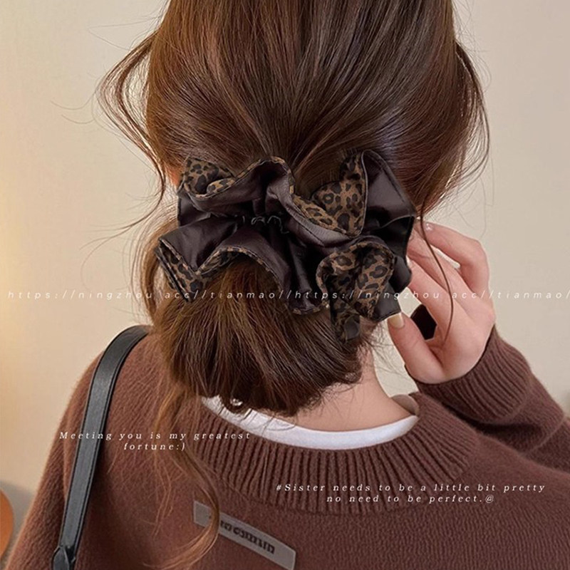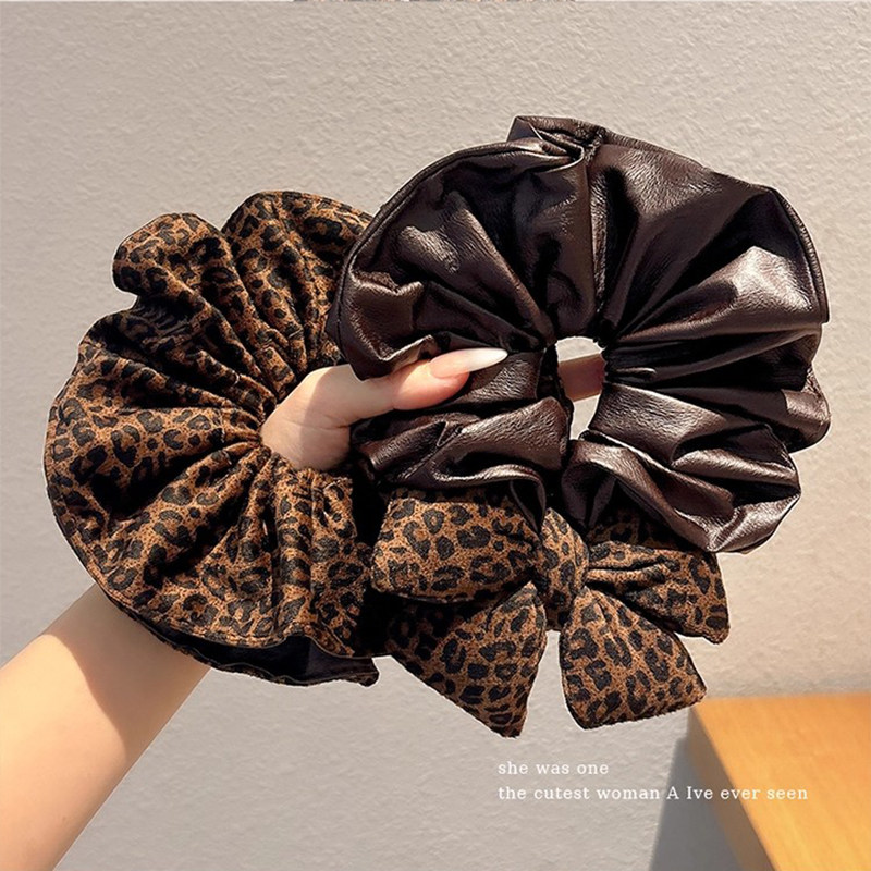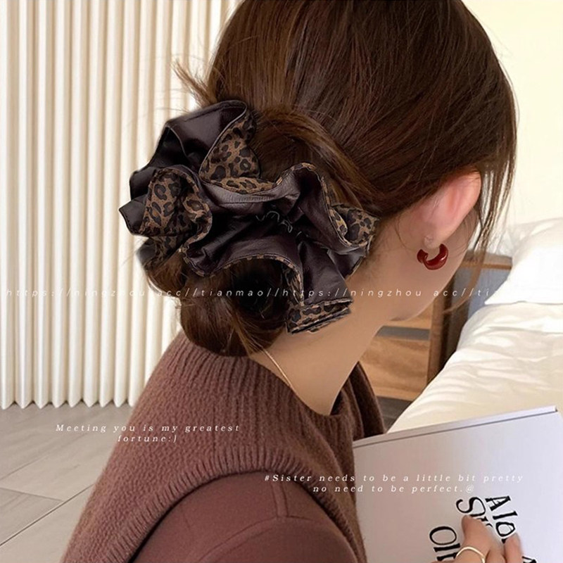 韩系咖色豹纹皮质大肠发圈女高级感丸子头超大号复古百搭发饰头绳