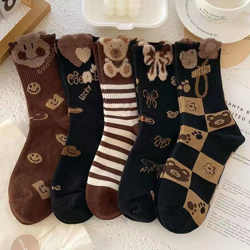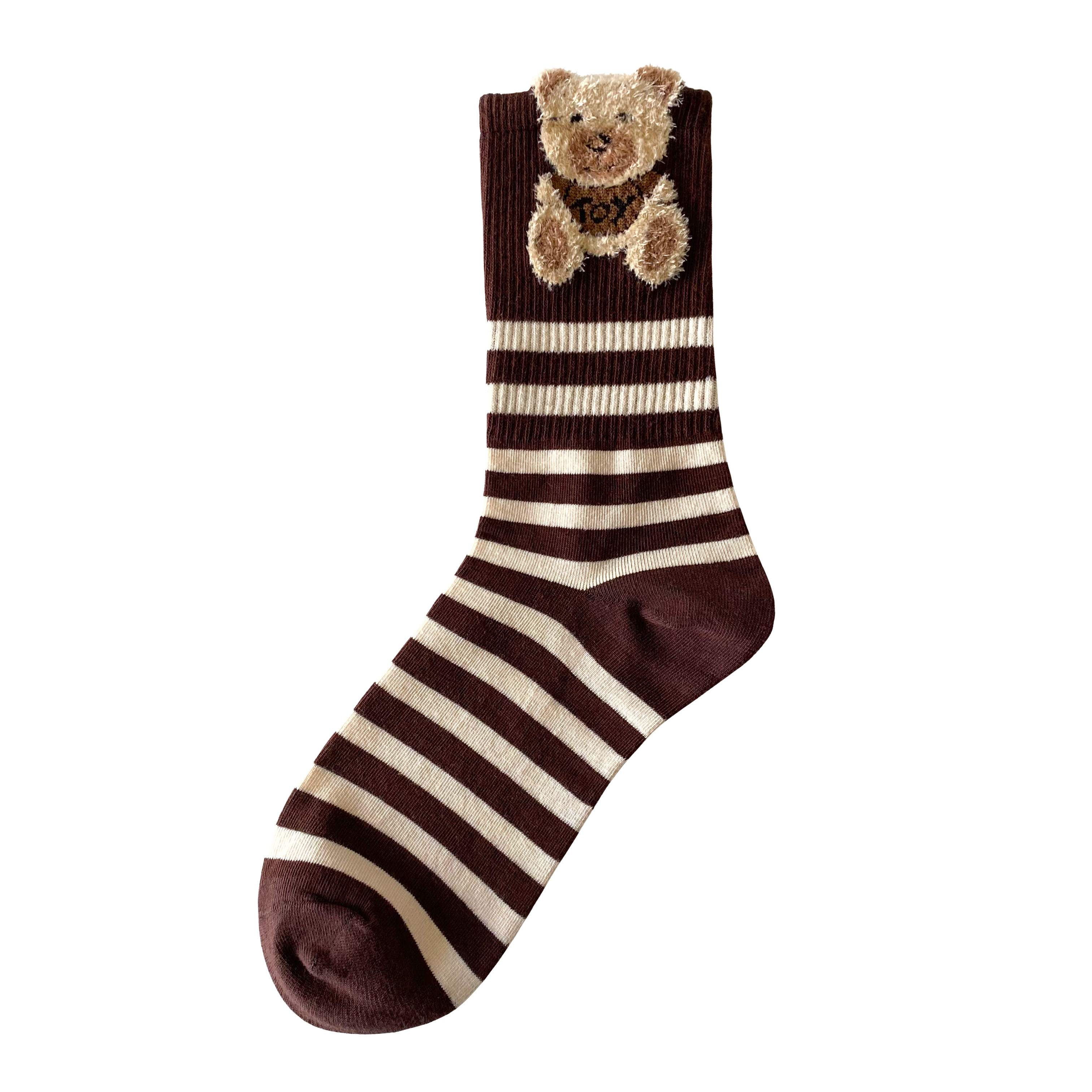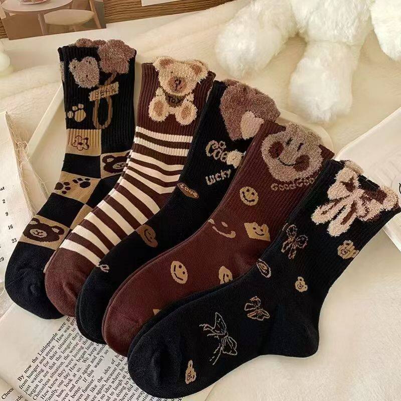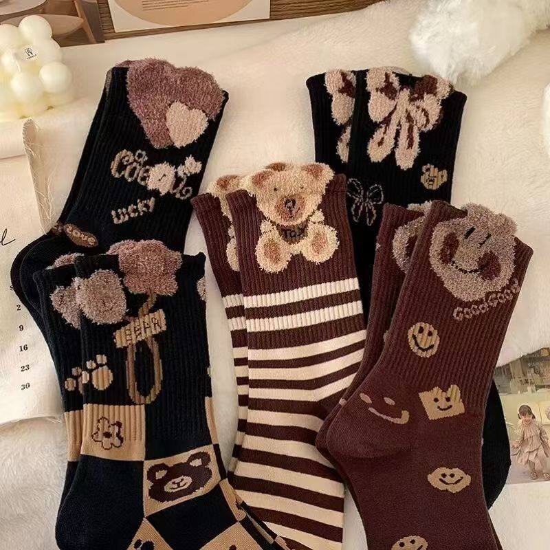 袜子女中筒袜纯色棉网红百搭新款ins潮立体植绒可爱小熊秋冬袜子