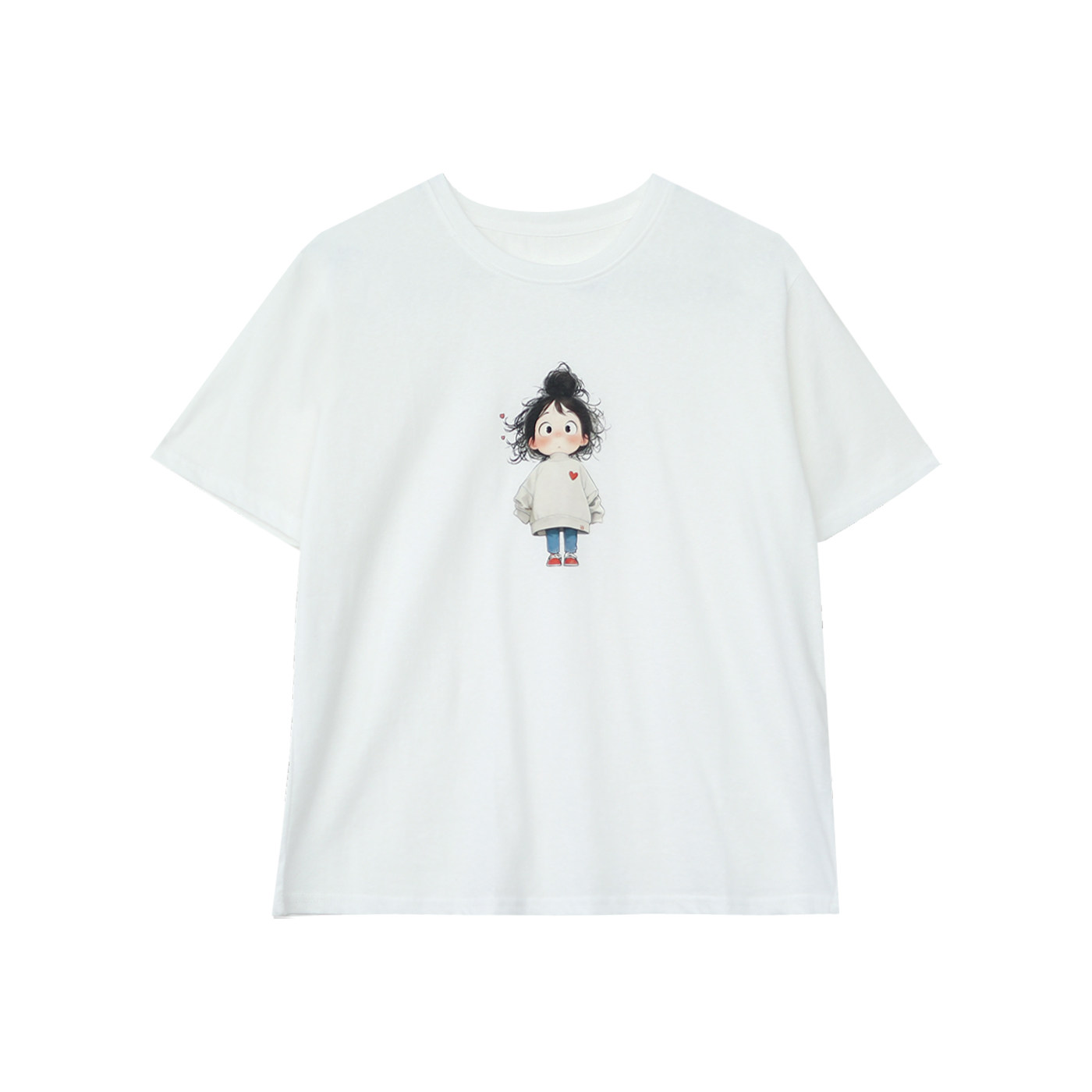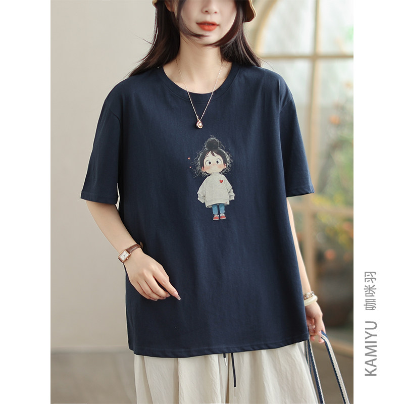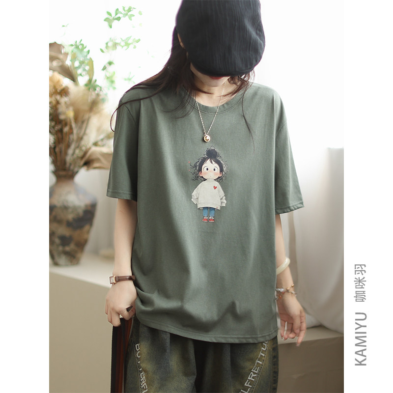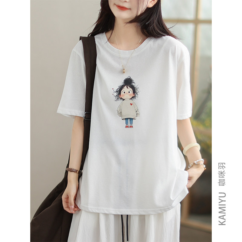 咖咪羽T恤女夏装女式新款文艺休闲卡通印花圆领纯色时尚女装短袖