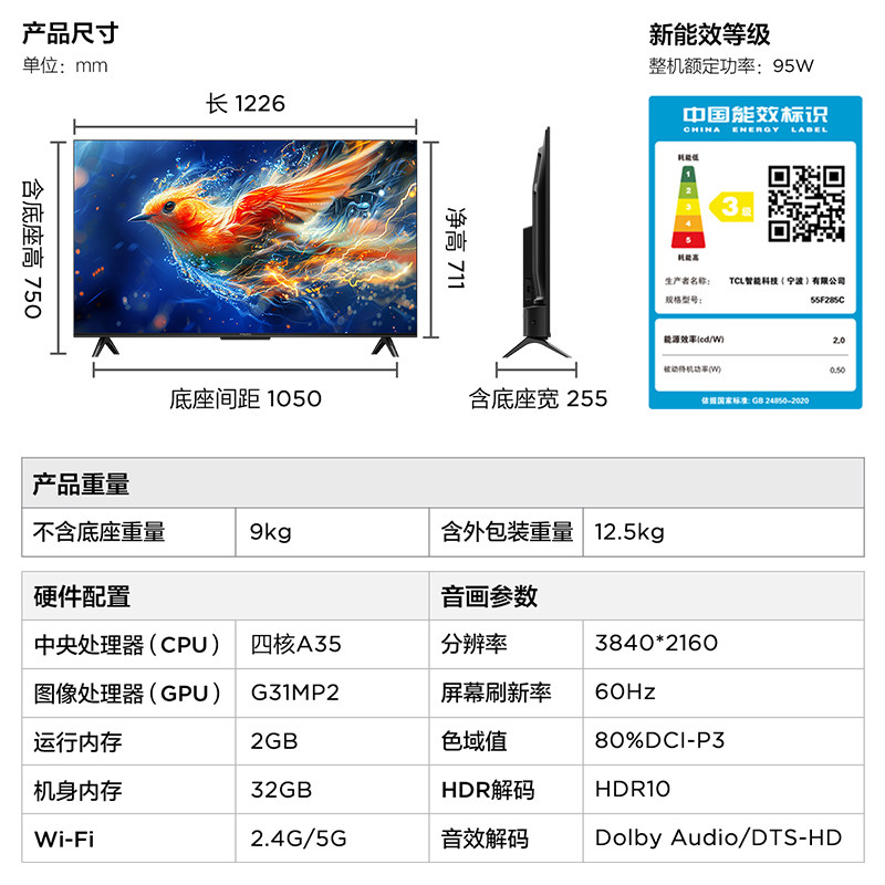 TCL雷鸟雀5 24款55英寸4K超高清智能网络语音液晶平板电视机官方