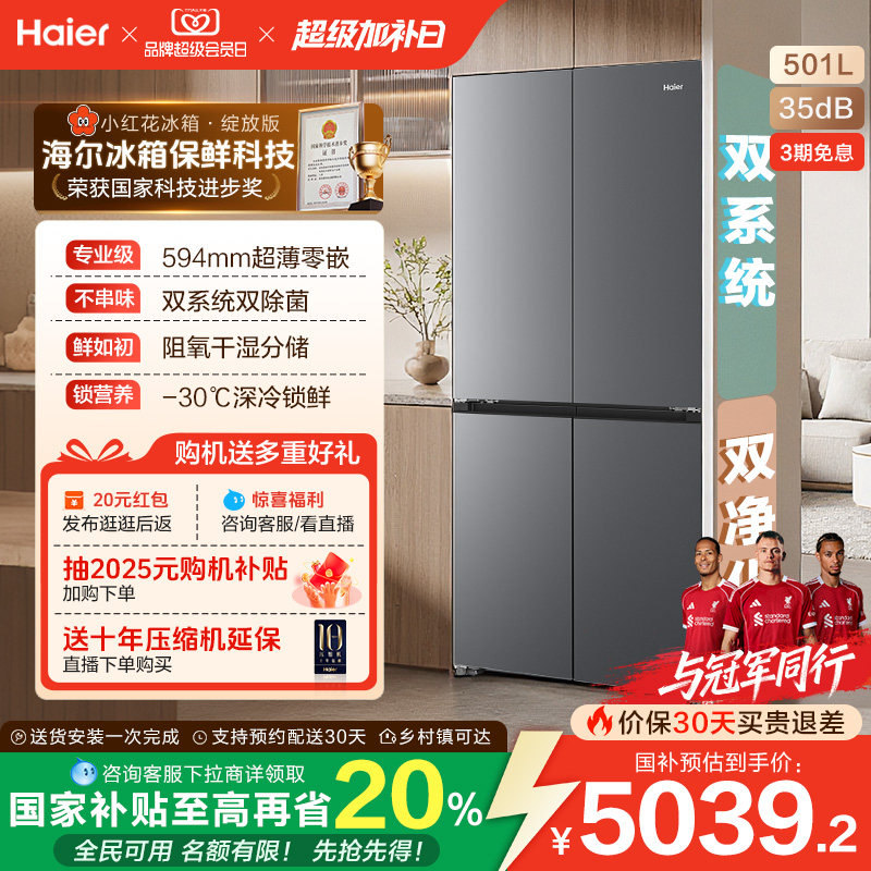【双系统】海尔小红花501L双开四门超薄零嵌入式风冷无霜家用冰箱