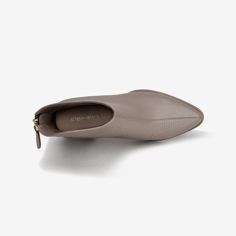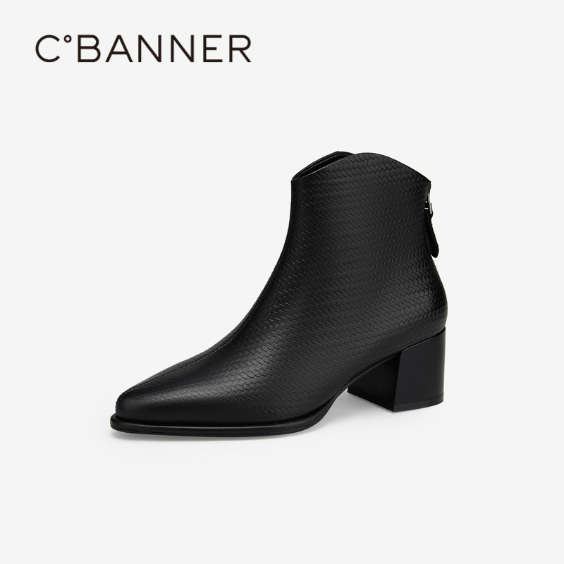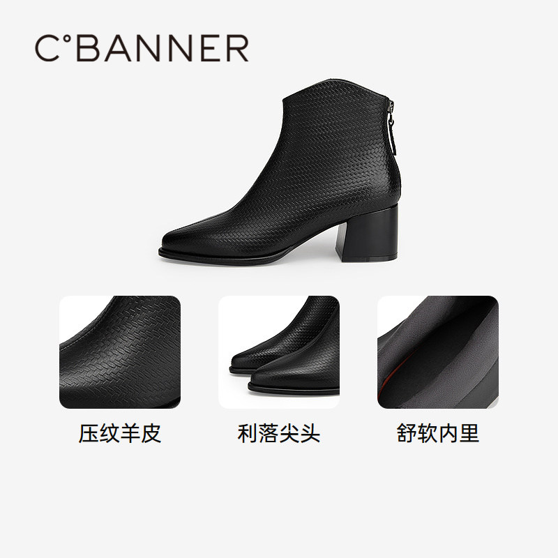 千百度压纹羊皮尖头时装鞋女款2024冬季新款粗高跟通勤短靴舒适
