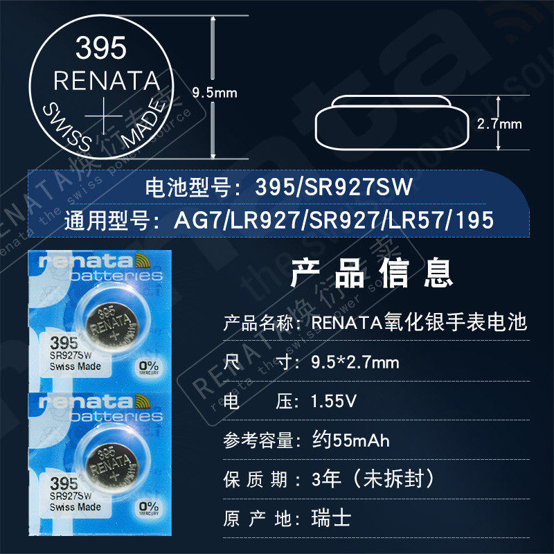 Renata瑞士395手表电池SR927SW适用日本7T92精工卡西欧EF-550/539/524阿玛尼AR1648 fossil换纽扣电子LR927用