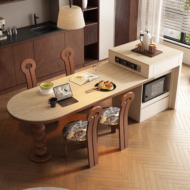法式中古风岛台餐桌一体式餐厅厨房家用现代伸缩实木岩板岛台餐桌