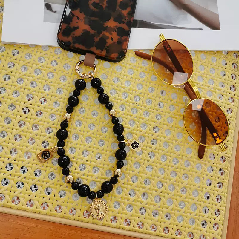 时尚黑金色小香风手机链墨镜链斜挎长款PU皮链串珠挂链小耳机包链