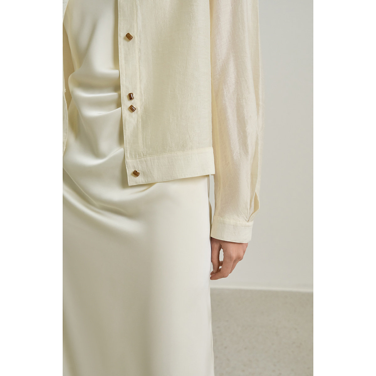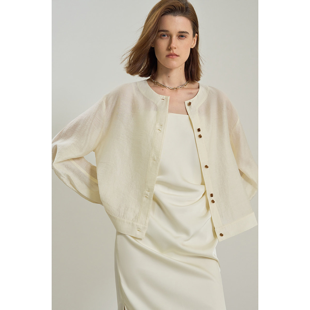 LILY2025新款女装含莱赛尔亚麻宽松休闲圆领轻薄米白色外套短款