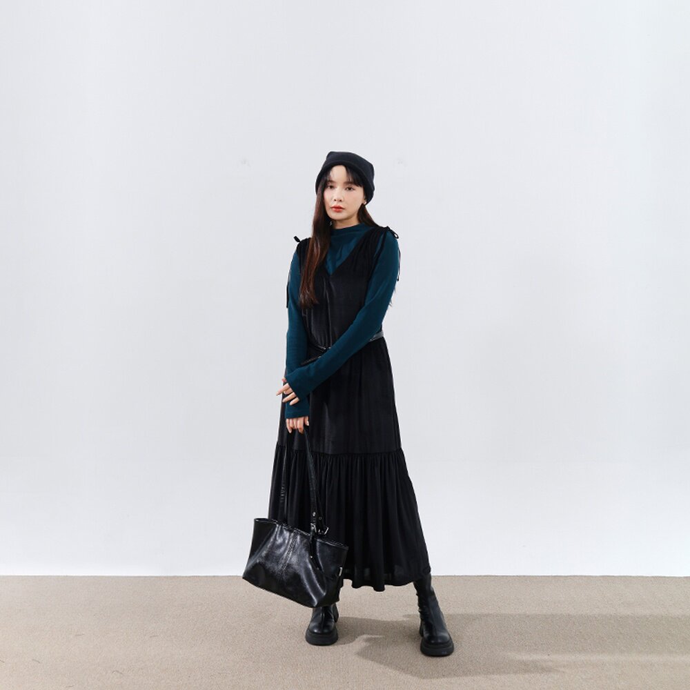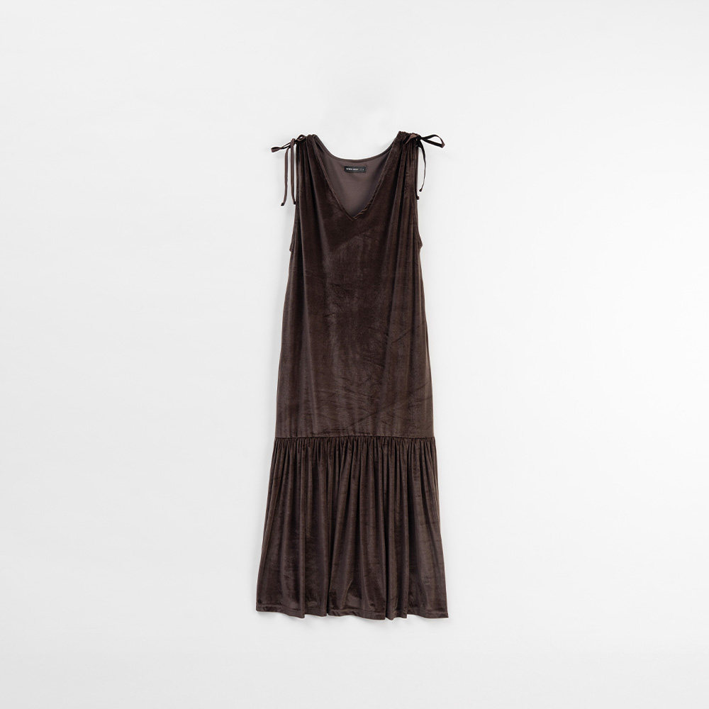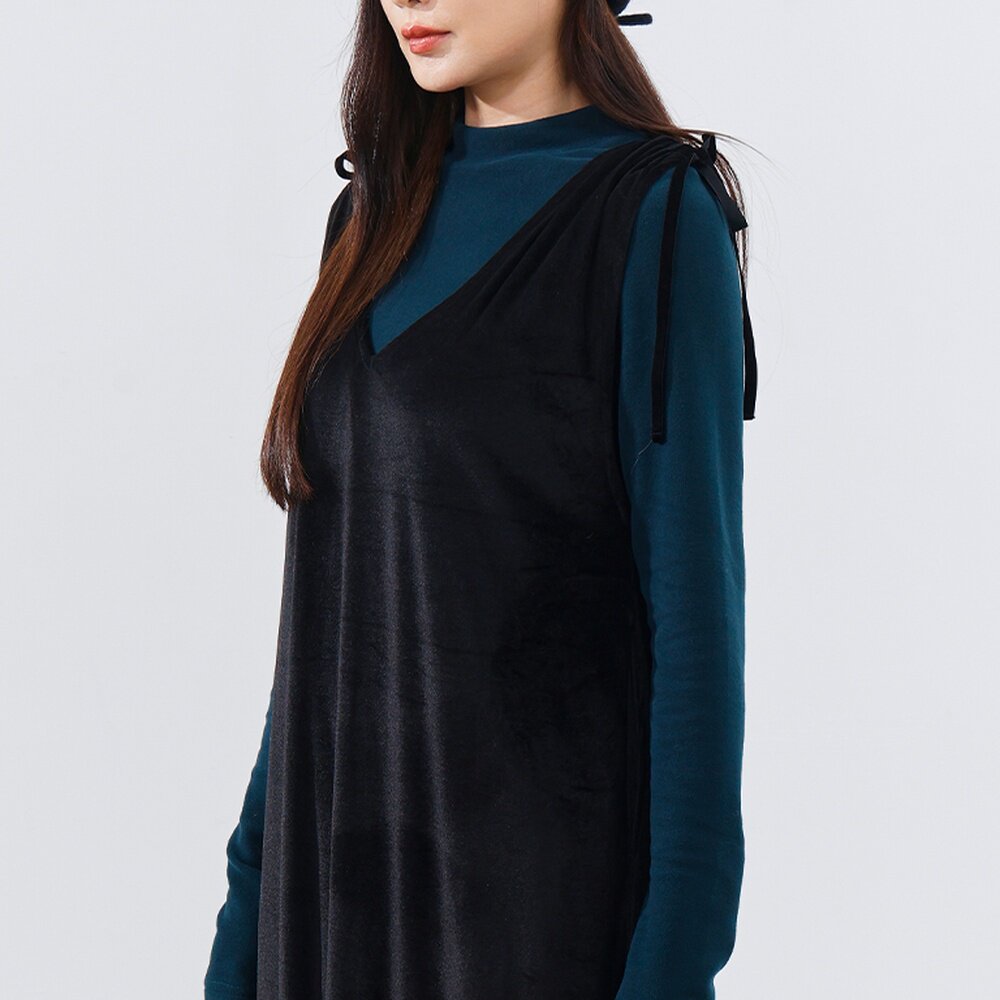 QUEENSHOP 2025秋冬新品女装微光泽绒面V领肩绑带连衣裙01087199