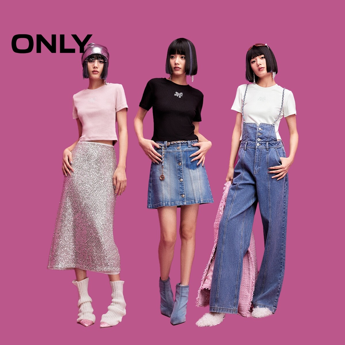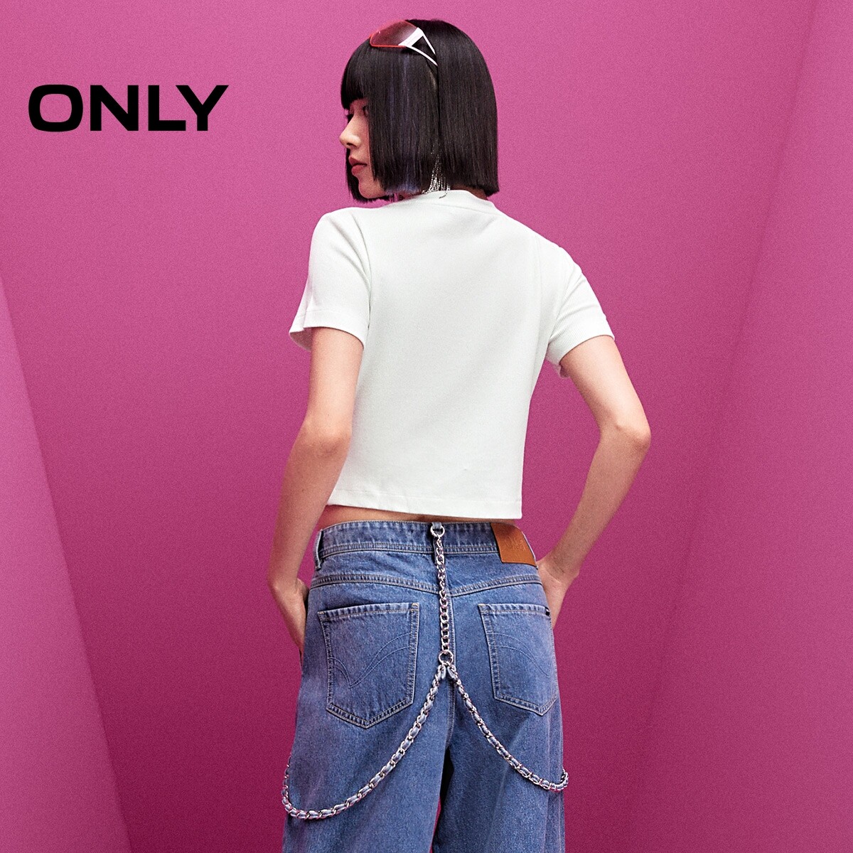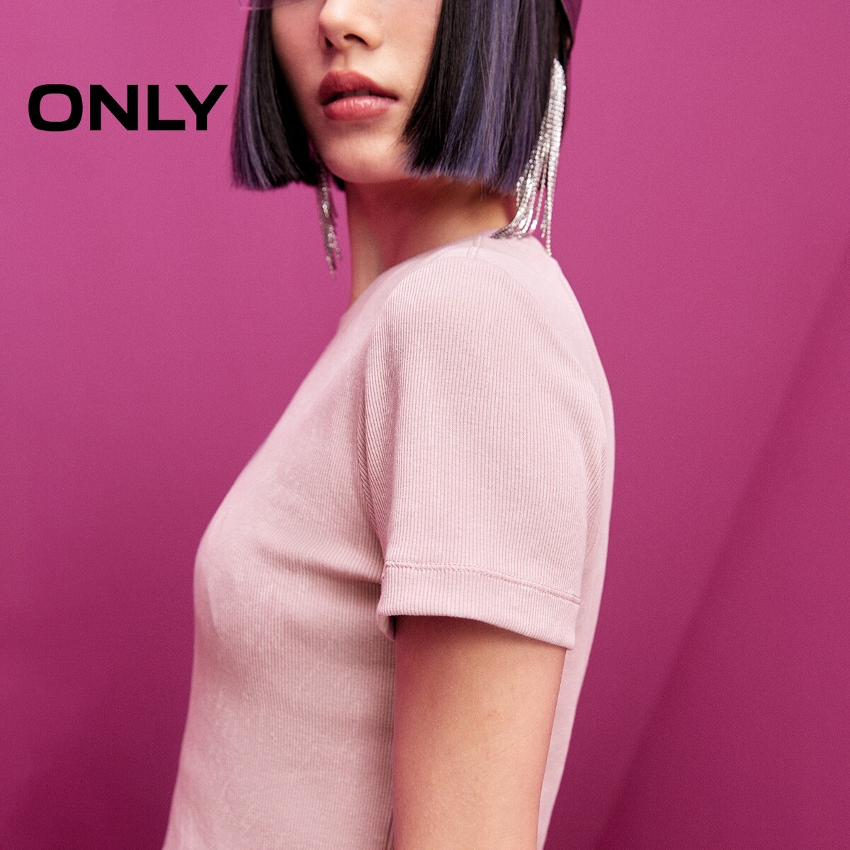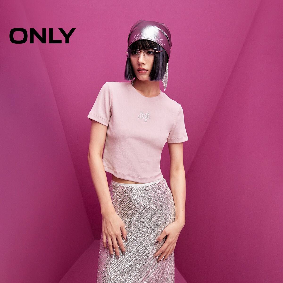 【ONLY奥莱】春款甜美水钻装饰蝴蝶结修身螺纹圆领短款短袖T恤女