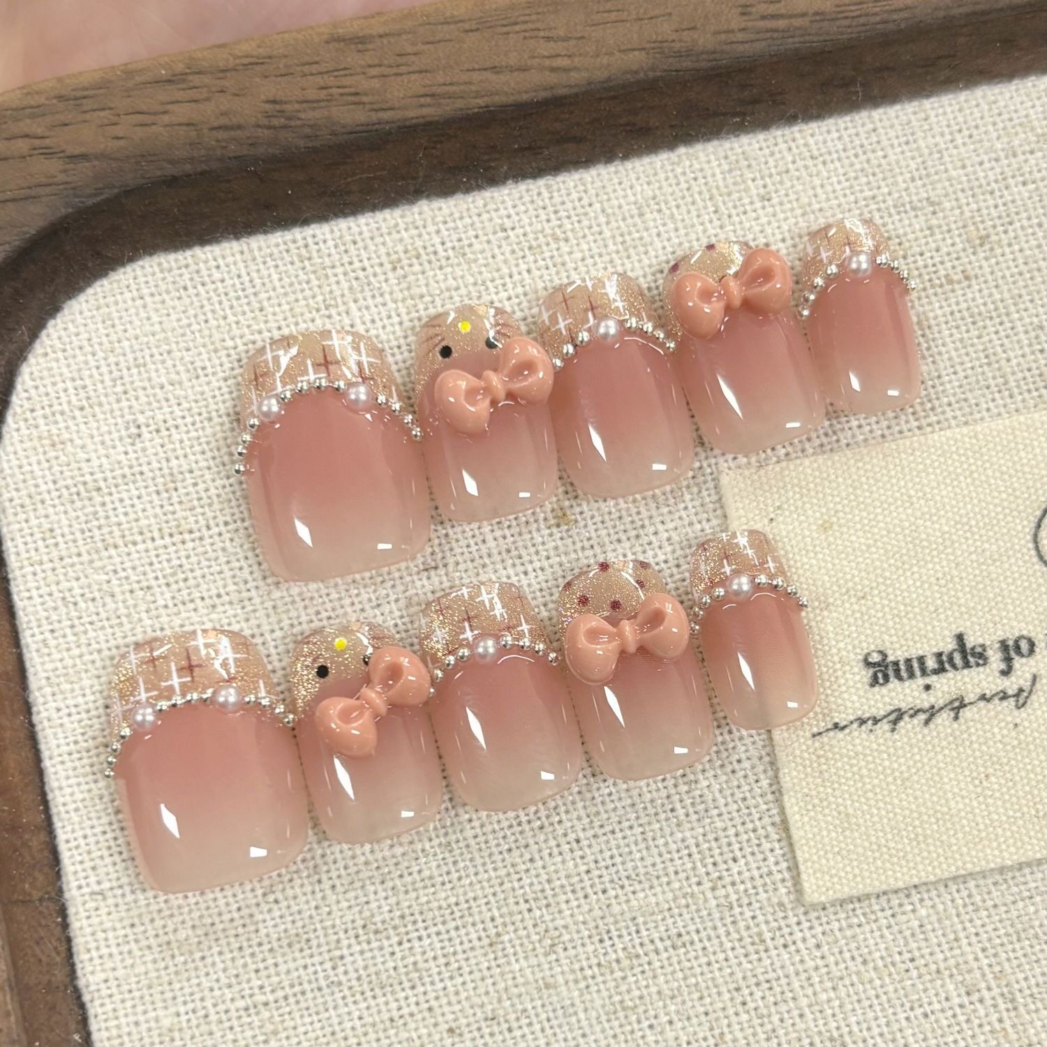 美甲穿戴甲短款可爱kt显白高级猫眼手工蝴蝶结法式爆闪黑皮郁金香