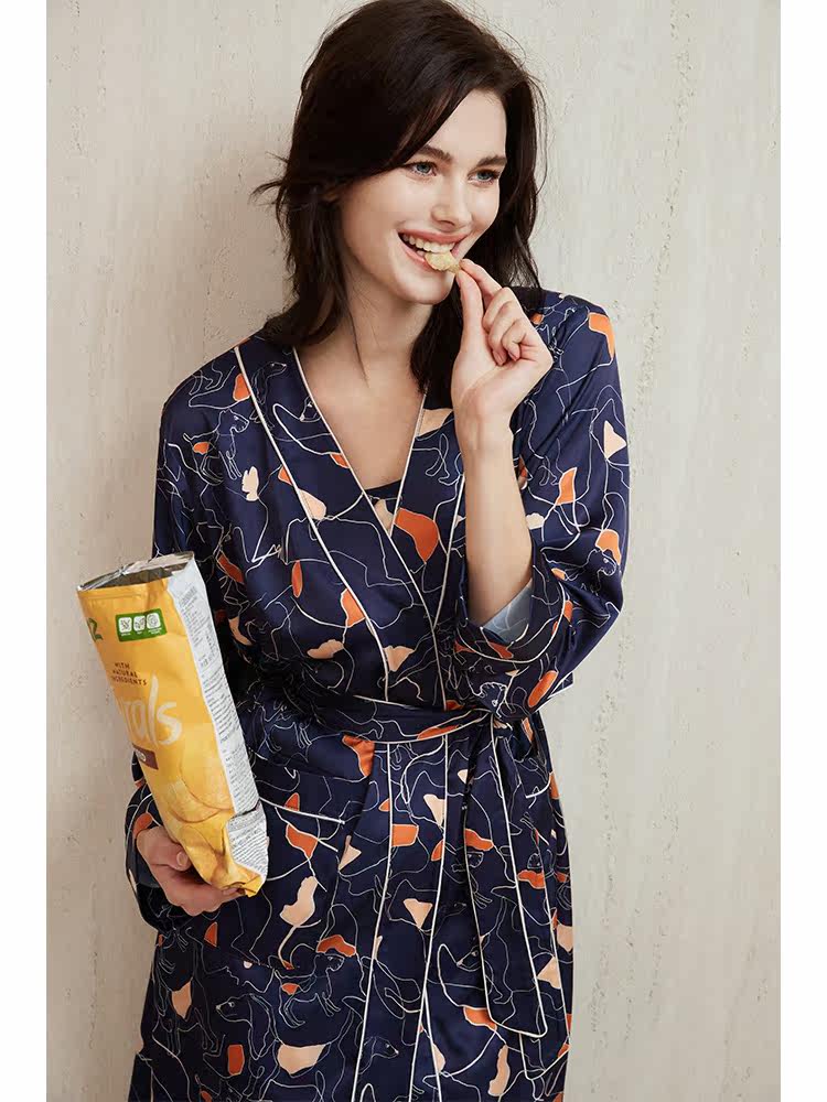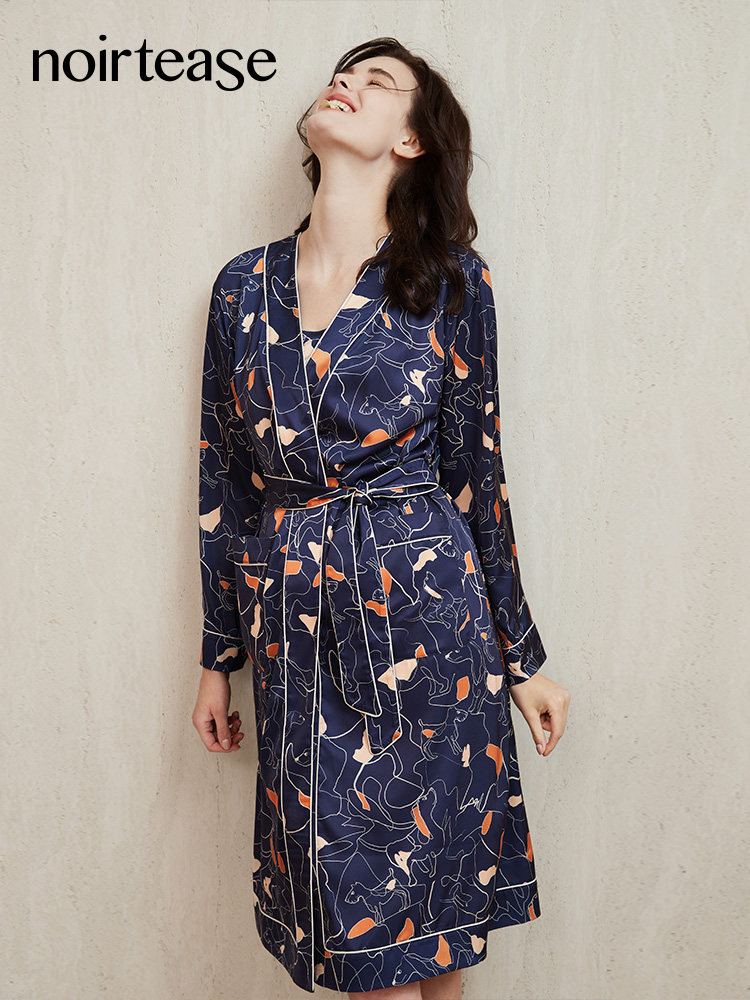 NoirTease春秋薄款丝质印花睡袍女士中长款系带浴袍睡衣家居服