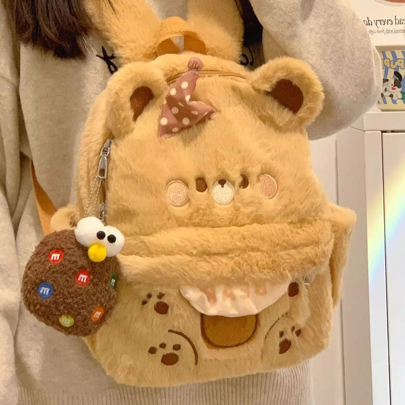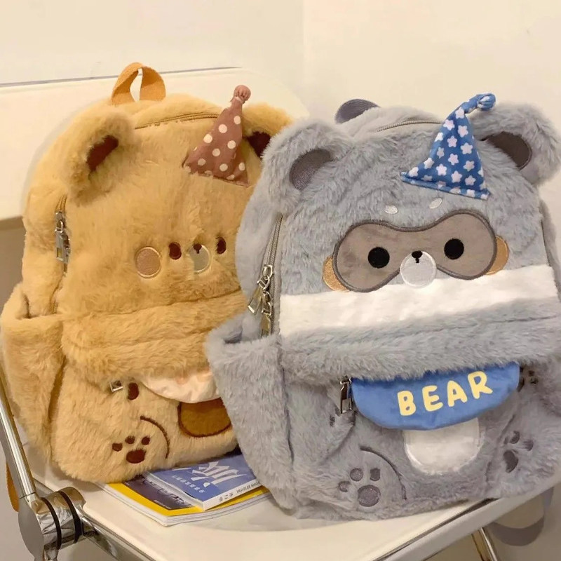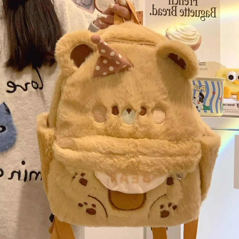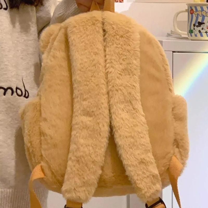 伊布古奇小熊毛绒双肩包秋冬可爱女小众手提百搭高颜值毛毛包棕色