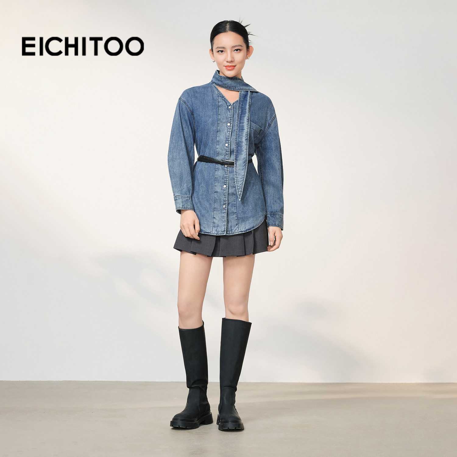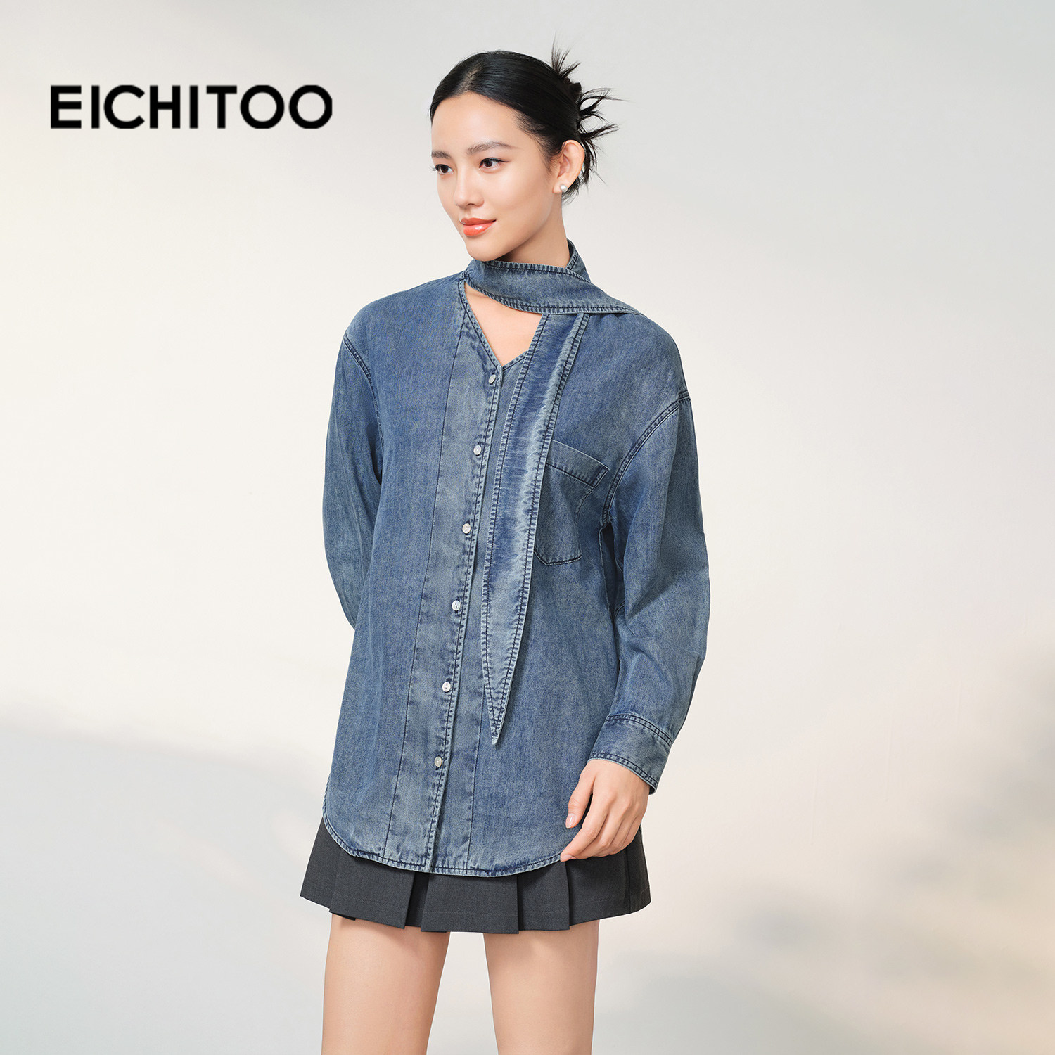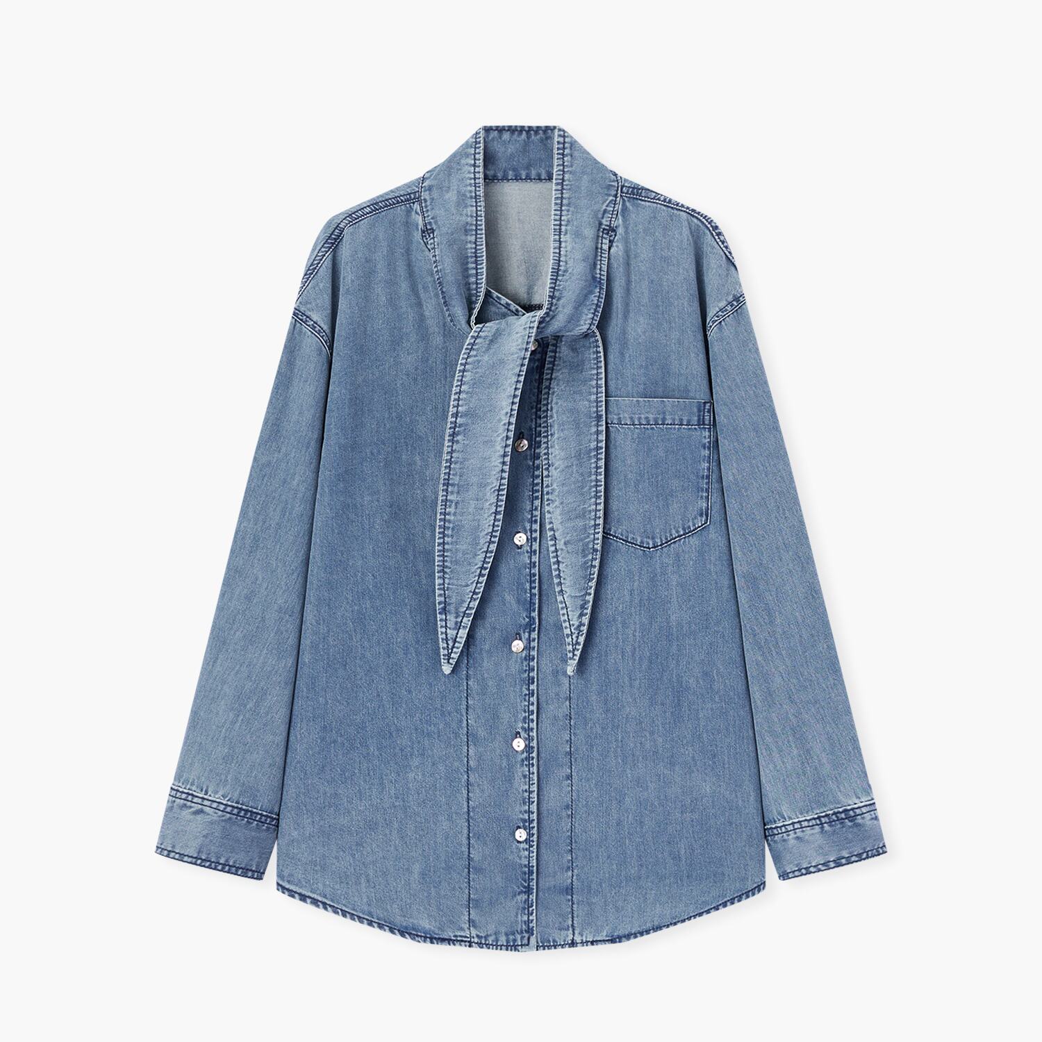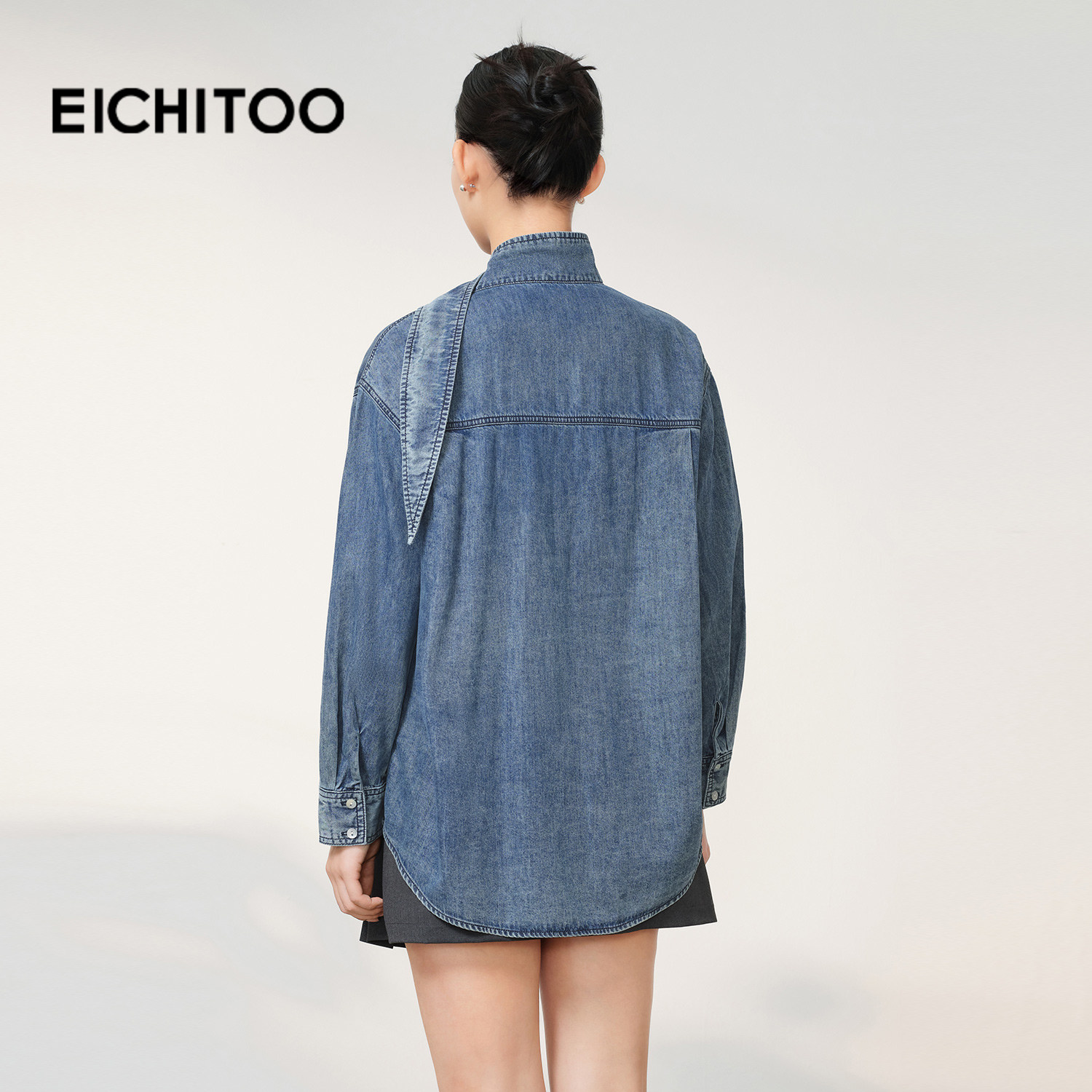 爱居兔系带领水洗牛仔衬衫女2026年春季新款含莱赛尔设计感上衣