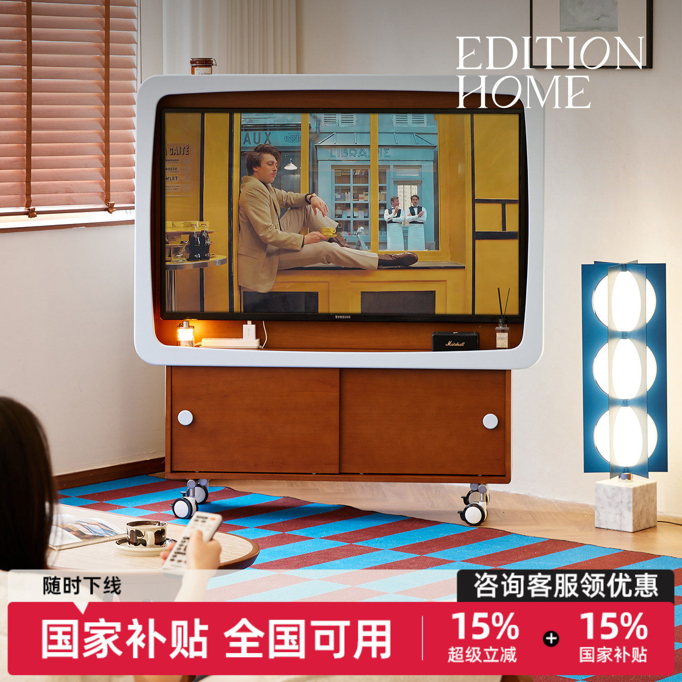 蓝调电视机架复古风电视柜客厅2025新款可移动电视收纳储物柜一体