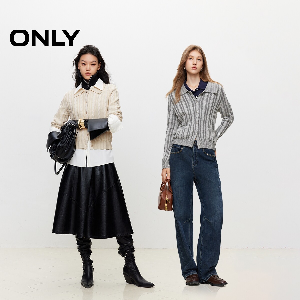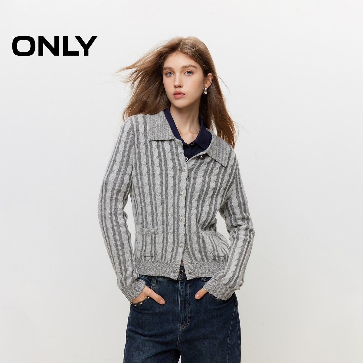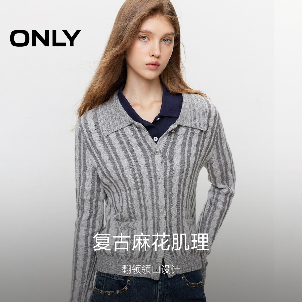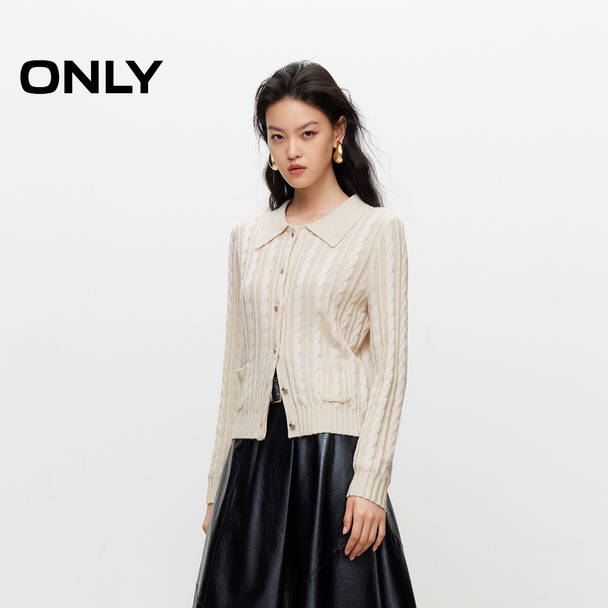 【ONLY奥莱】春季新款简约通勤翻领正肩长袖开衫针织衫女
