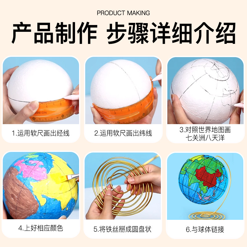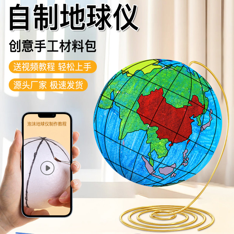 DIY地球仪手工制作材料包小学生初中生专用自制简易大号儿童启蒙小号空白泡沫球圆球模型地理手绘套装半成品