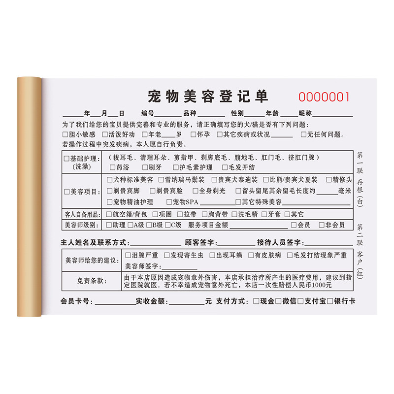 宠物店美容登记表二联定制医疗接待住院护理记录本两联前台服务预约记账本2连会员消费单二连洗澡洗护协议2联