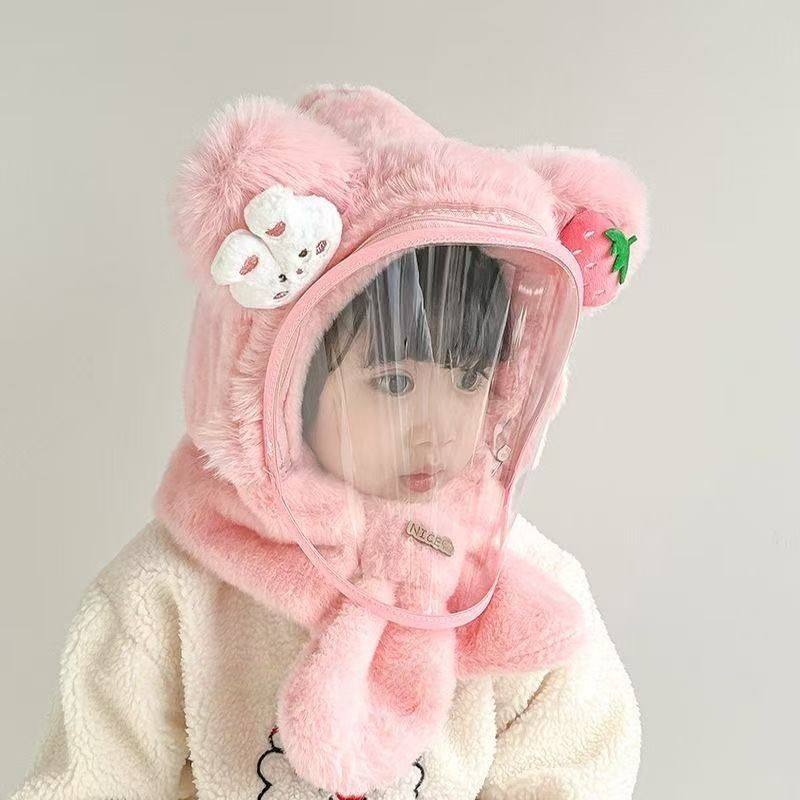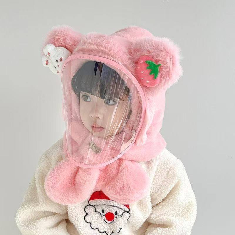 宝宝帽子冬骑行保暖毛绒帽男女童防护面罩儿童围巾手套一体帽防风